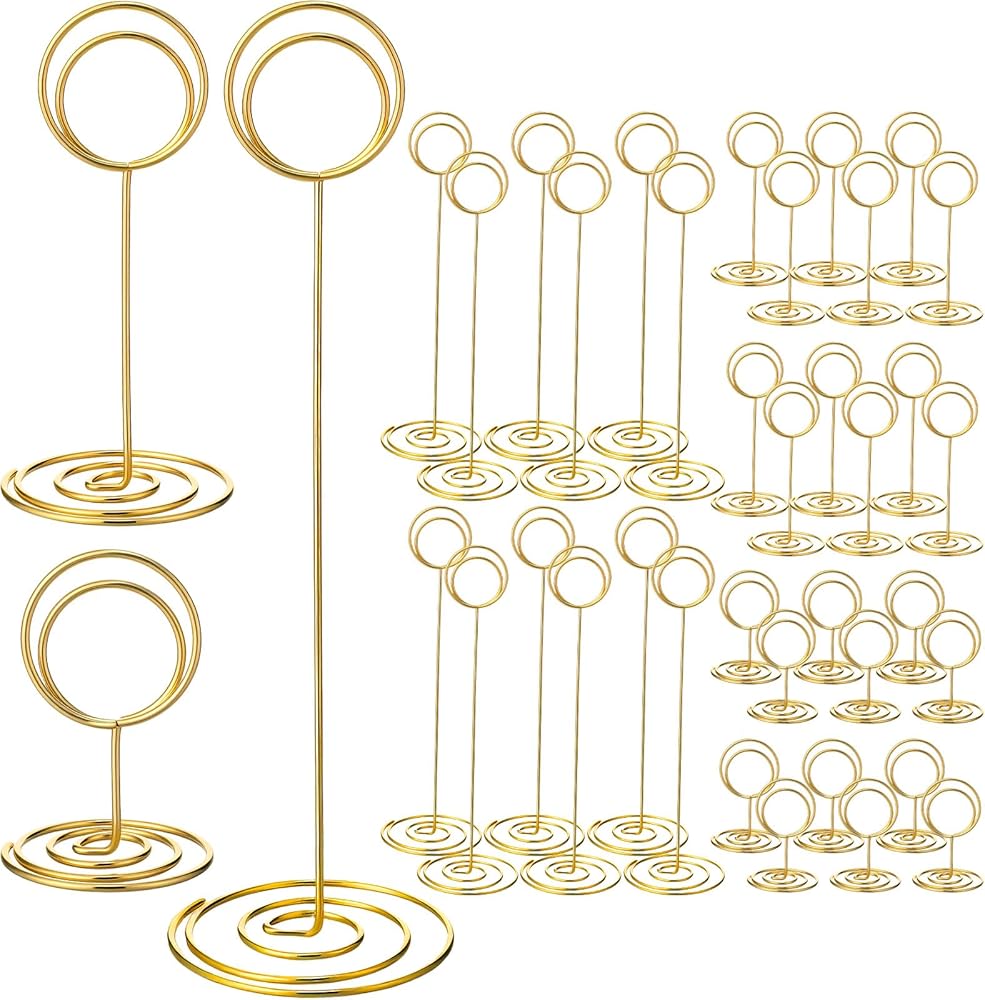 【Multi-Size Set】This table numbers holders set includes 36 pieces in three heights: 8.75 inches, 3.35 inches, and 2 inches, offering flexibility for various table settings and display needs. The multi-size design allows you to choose the right height for different occasions, whether for wedding table numbers, office memos, or photo displays. Each metal card holder is designed with a spiral base for better stability and a unified gold finish for a consistent aesthetic.