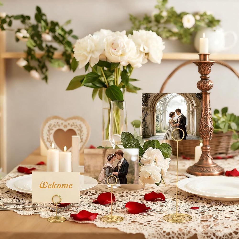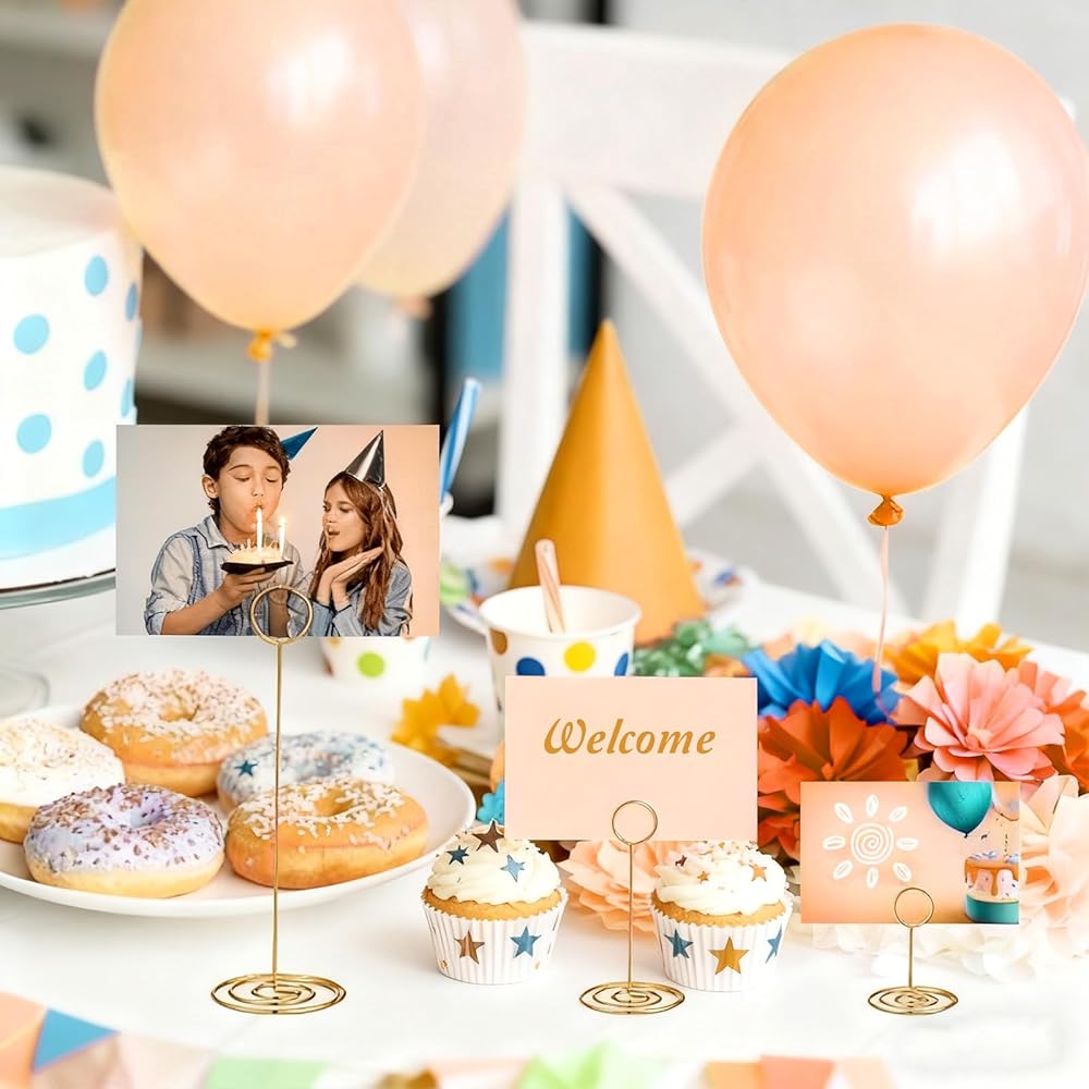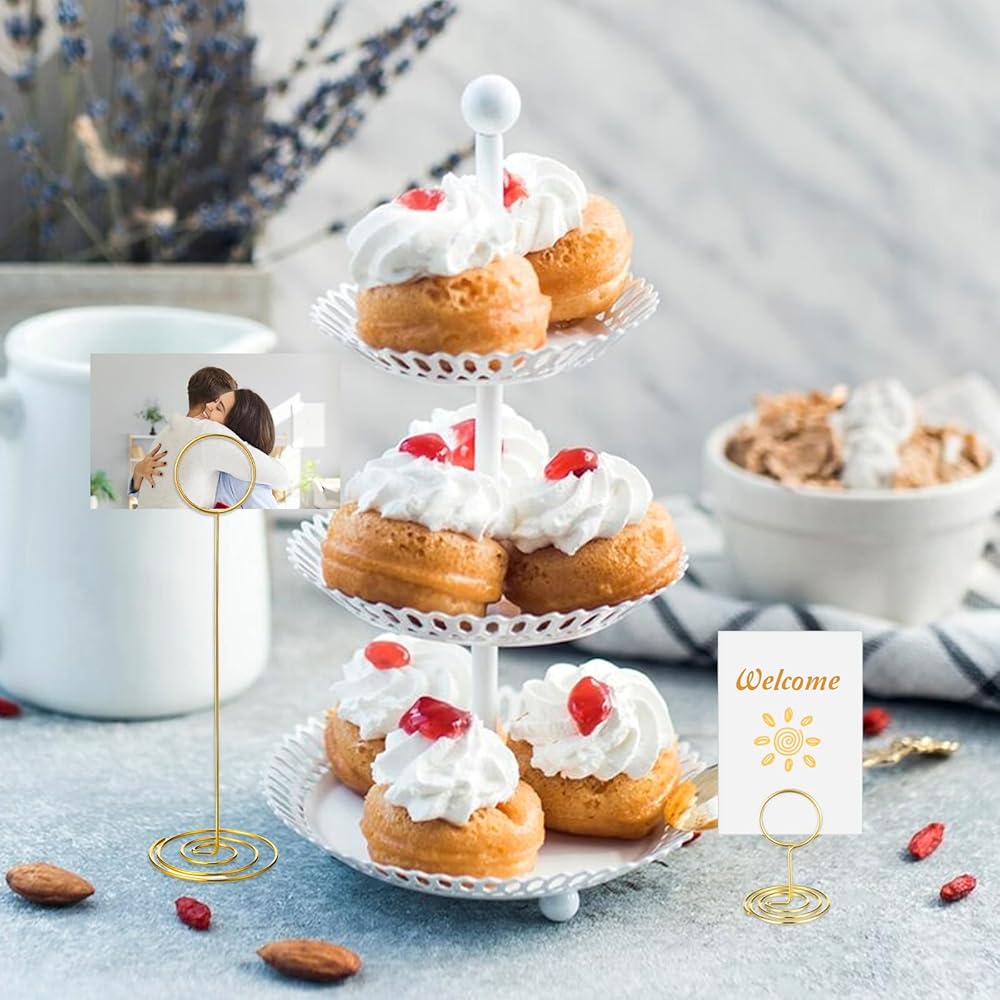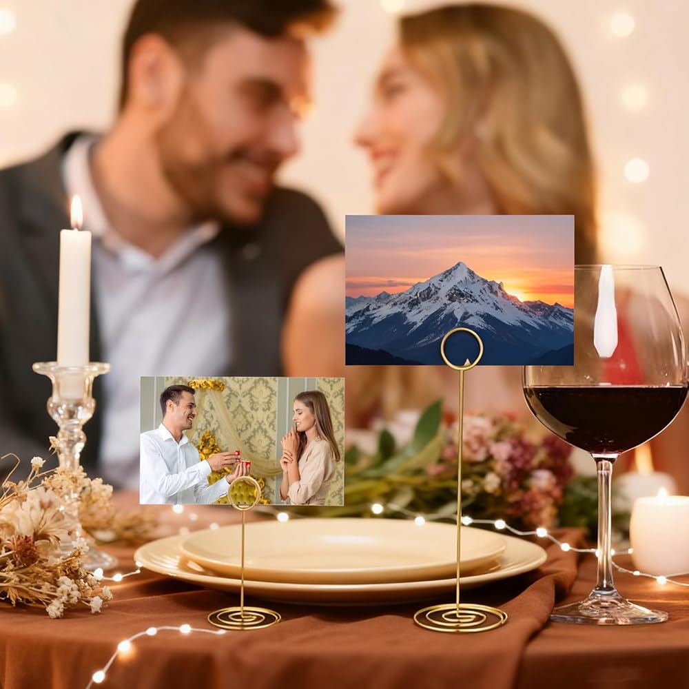 【Reliable material】Made from gold-plated iron wire, these table card holders are both and elegant. The thick wire resists bending, and the weighted spiral base prevents tipping, even on uneven surfaces. These picture holder stands securely hold 4x6 photos, place cards, or memos without slipping, making them for both indoor and outdoor events where wind might be a concern.