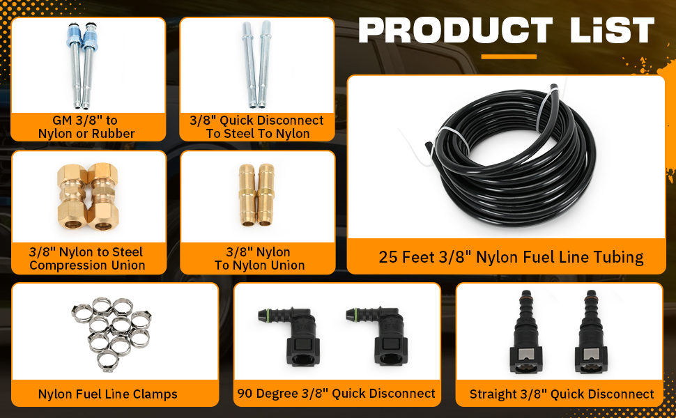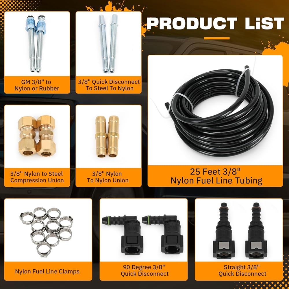 Package Includes: 1x 25 Feet 3/8" Nylon Fuel Line Tubing; 2x 90 Degree 3/8" Quick Disconnect; 2x Straight 3/8" Quick Disconnect; 2x 3/8" Nylon to Steel Compression Union; 2x GM 3/8" to Nylon or Rubber; 2x 3/8" Quick Disconnect To Steel To Nylon; 2x 3/8" Nylon To Nylon Union; 10x Nylon Fuel Line Clamps.