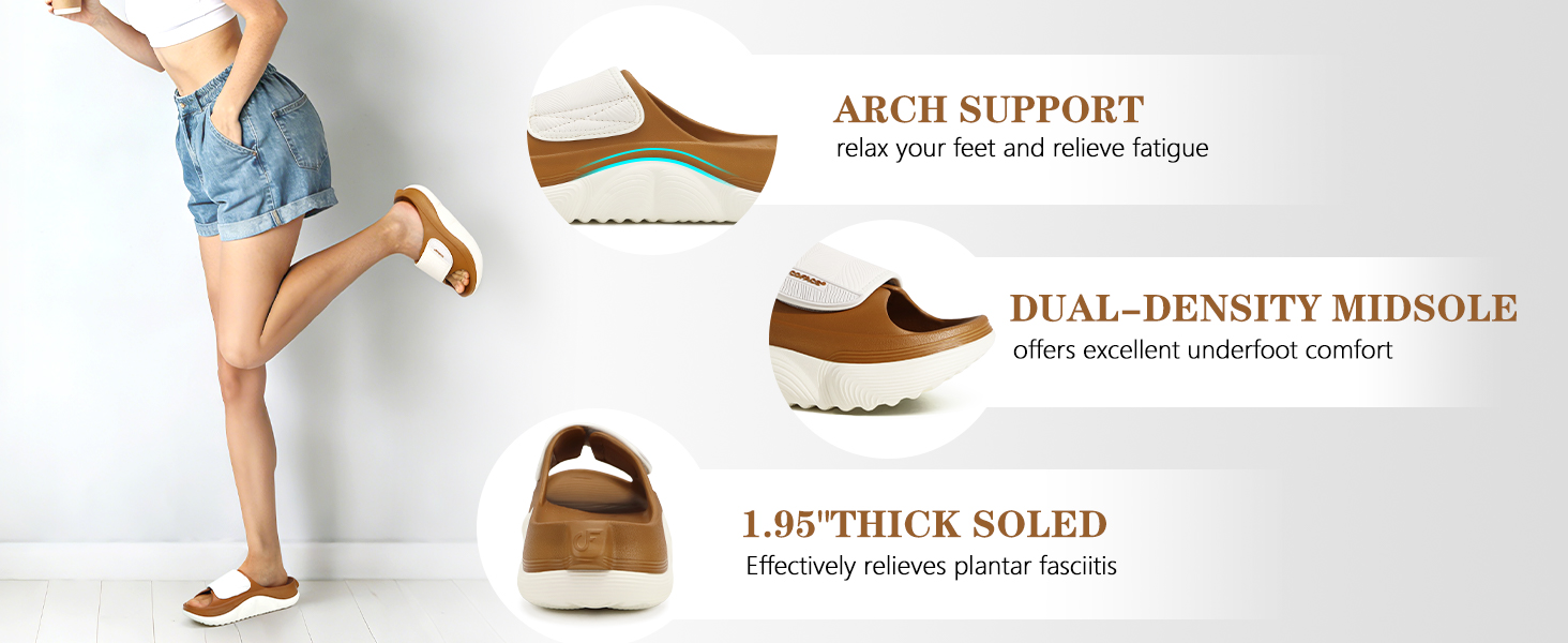 Arch Support: These slides feature an ergonomically designed arch that conforms to the foot's natural shape, providing excellent support while distributing pressure and alleviating foot fatigue.