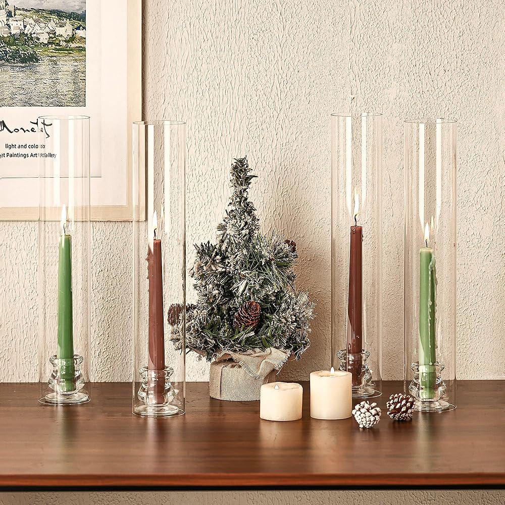 Hurricane Glass Candle Holders with Candlestick Holders Set of 6 Tall Clear Cylinder Covers for Taper Candles, 13.82" Glass Chimney Candle Holder Set for Wedding Centerpieces, Dining Table Home Decor