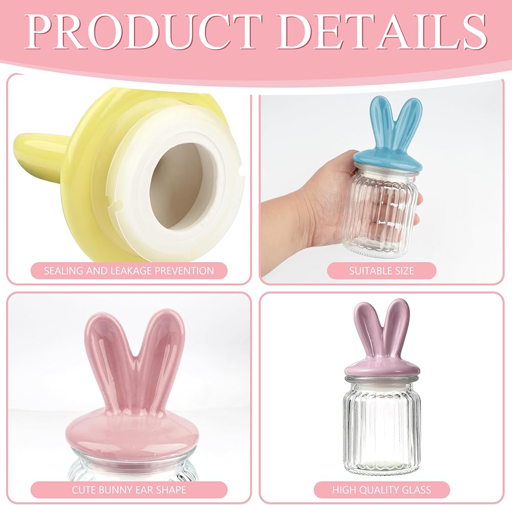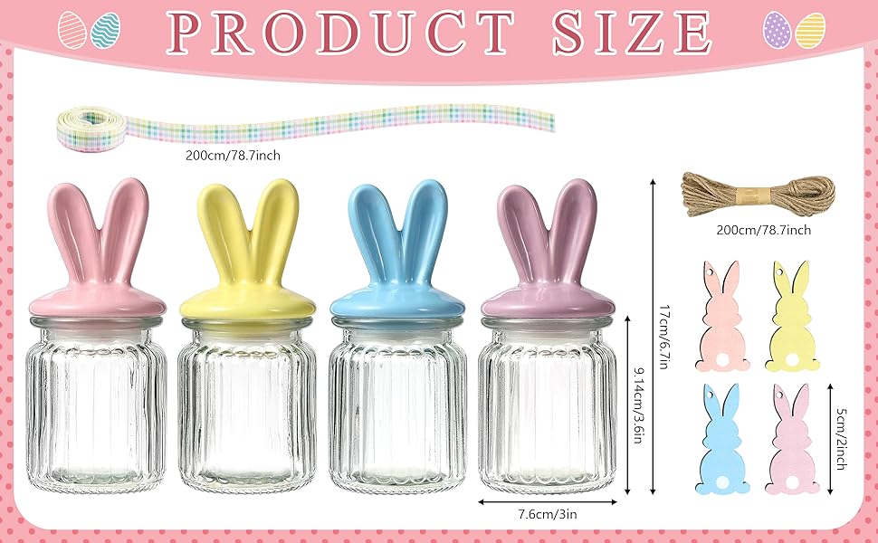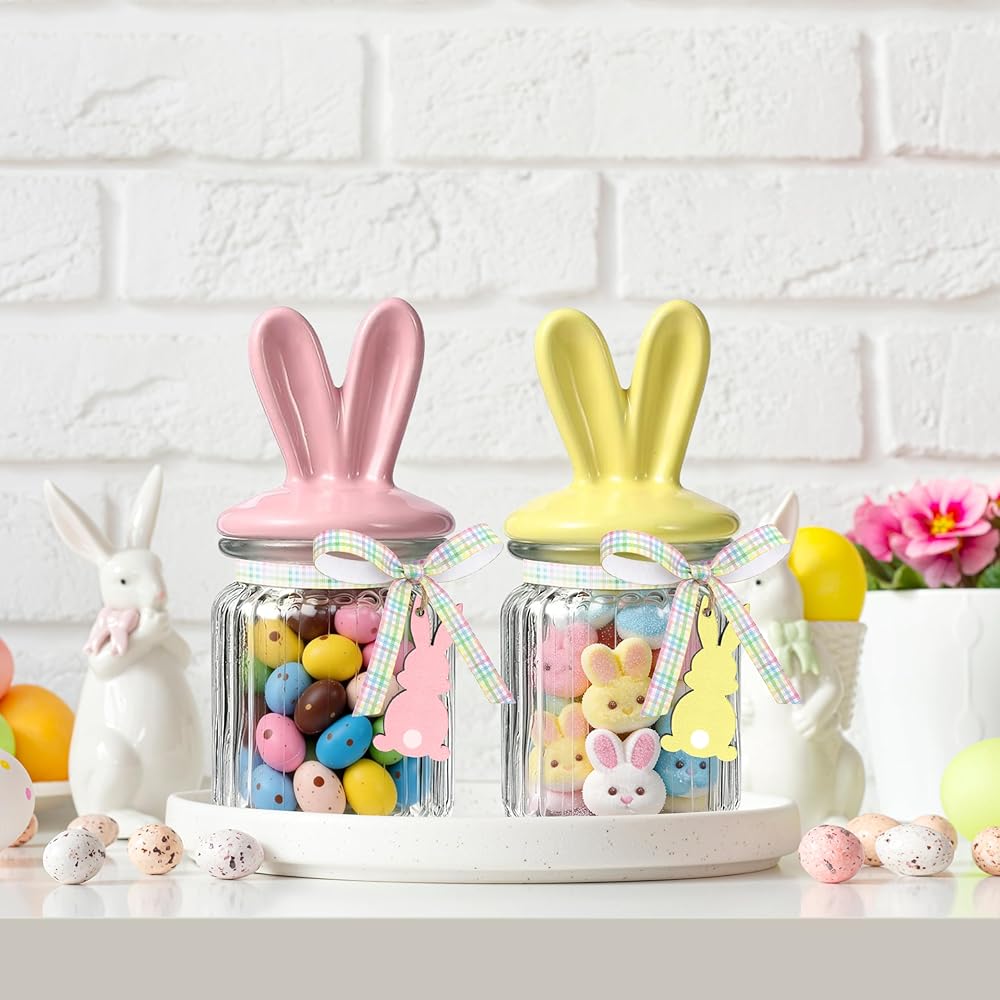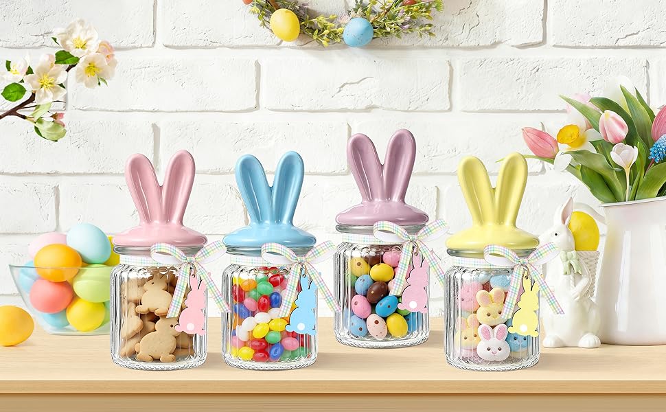 Easter Bunny Glass Jars - This set of Easter candy jars includes 4 clear glass jars paired with 4 ceramic bunny ear lids in pastel colors, 4 wooden bunny tags, a roll of jute twine, and 1 checkered ribbon. Each Easter glass jar is carefully curated to be both practical and decorative, making it ideal for springtime parties or Easter celebrations.