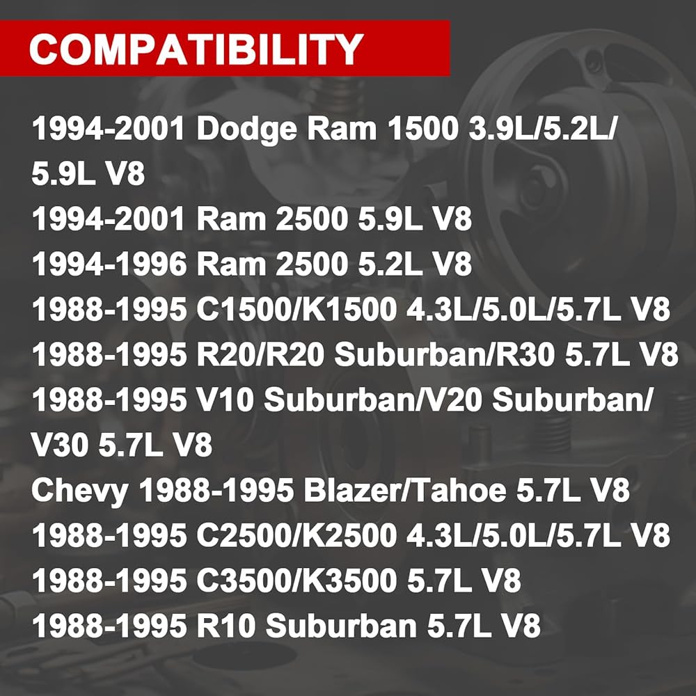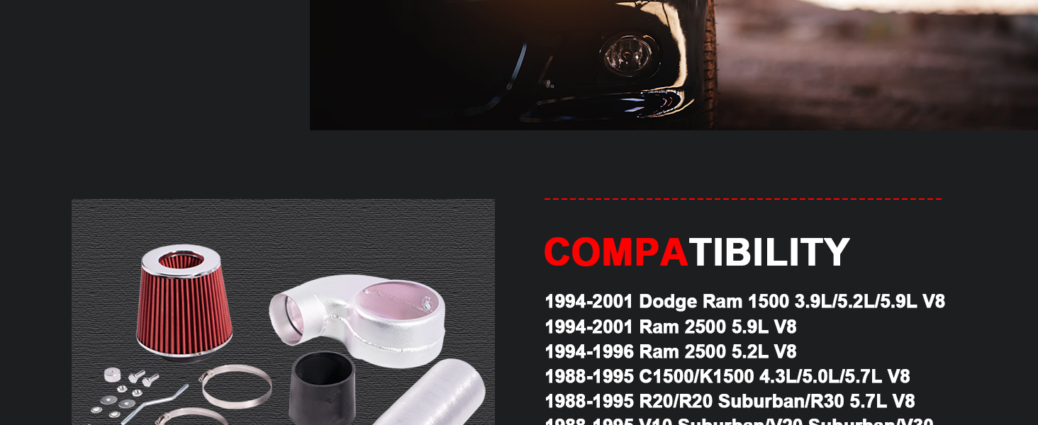 【Vehicle Fitment】Cold Air Intake Kit Compatible with 1994-2001 Dodge Ram 1500 3.9L/5.2L/5.9L V8; for 1994-2001 Ram 2500 5.9L V8; for 1994-1996 Ram 2500 5.2L V8;for 1988-1995 C1500/K1500 4.3L/5.0L/5.7L V8; for 1988-1995 R20/R20 Suburban/R30 5.7L V8;for 1988-1995 V10 Suburban/V20 Suburban/V30 5.7L V8; for Chevy 1988-1995 Blazer/Tahoe 5.7L V8; for 1988-1995 C2500/K2500 4.3L/5.0L/5.7L V8; for 1988-1995 C3500/K3500 5.7L V8; for 1988-1995 R10 Suburban 5.7L V8.