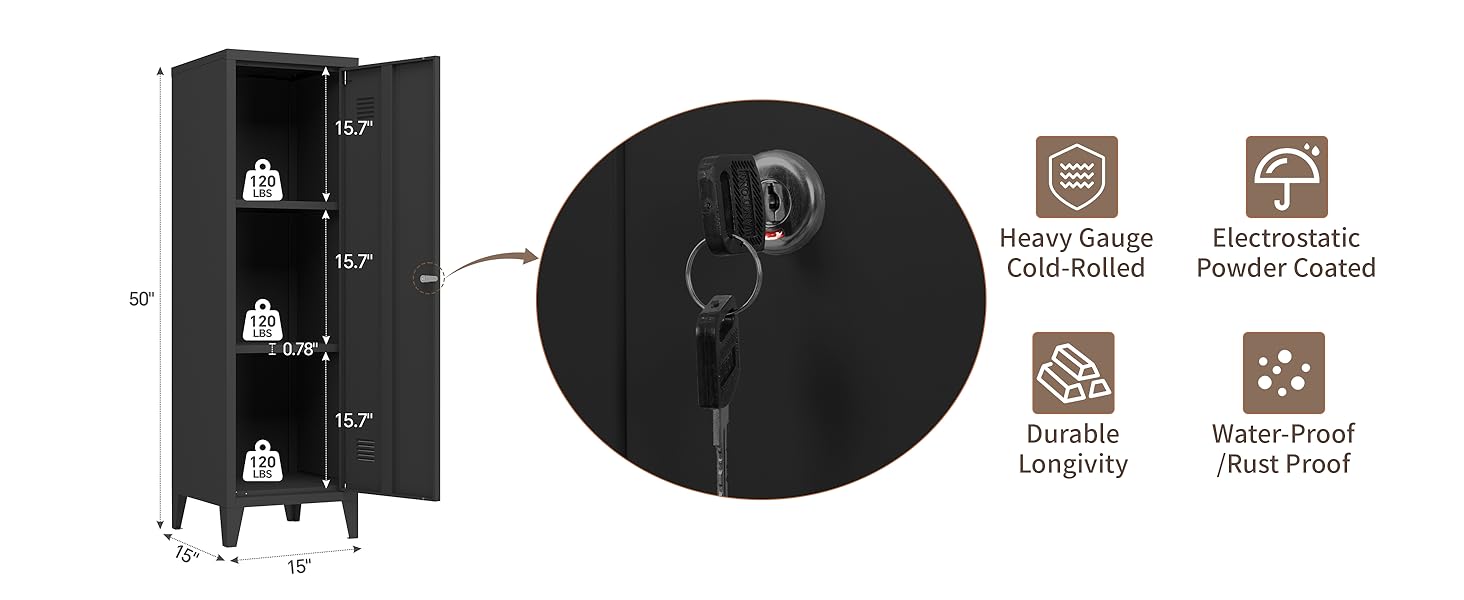 【Dimensions】Size: W 15"X D 15"X H 50", 4 detachable legs, The locker features 3 shelves to provide large storage space for various items.