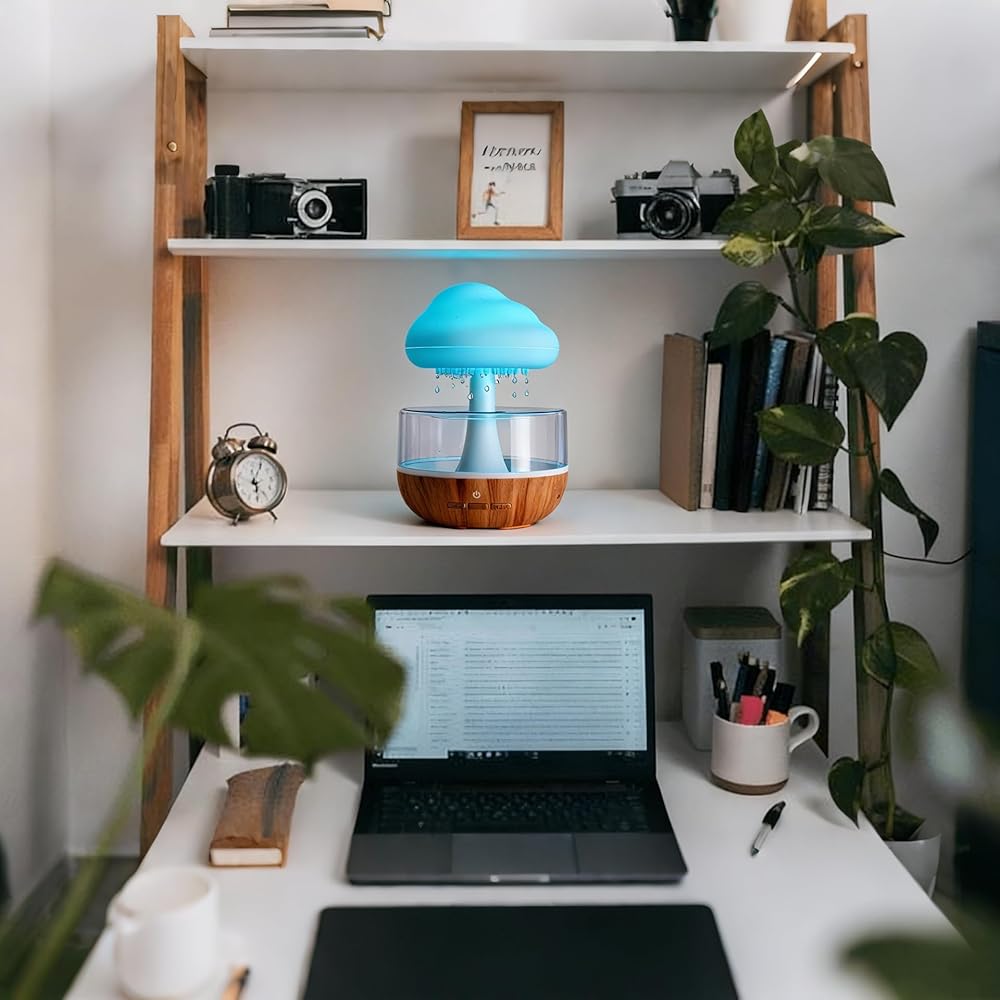 مصباح المطر السحابي من Weljoy Mushroom Cloud، نافورة منضدية LED متغيرة 7 ألوان مع أصوات تنقيط الماء، ديكور مكتب قابل لإعادة الشحن عبر USB للمنزل والمكتب (قاعدة خشبية)