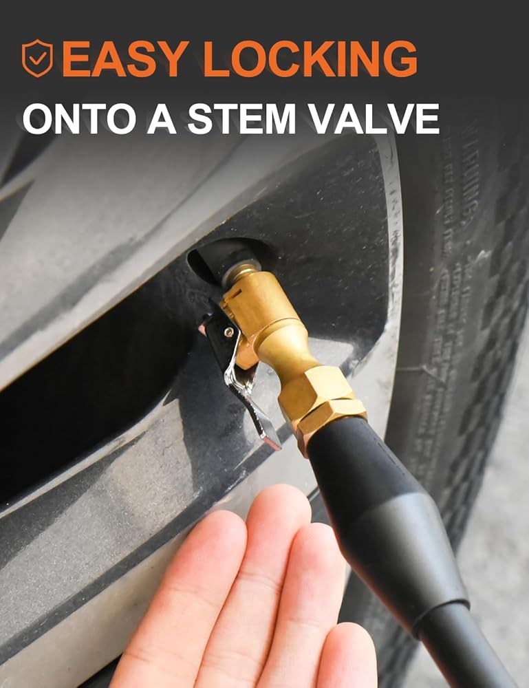 Lock on Air Chuck with Clip easy locking onto stem valves. A straight tip makes inflation hassle free.