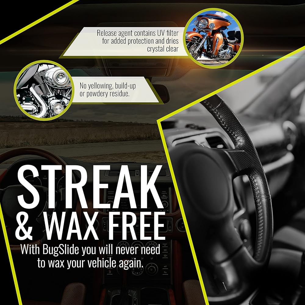 Streak and Wax-Free – With Bugslide's car cleaner, you will never need to wax again. Applied and paired best with a microfiber cloth to wipe clean, the release agent in the spray bottle contains a UV filter for added protection and dries crystal clear with no yellow tint, film, build-up or powdery residue.
