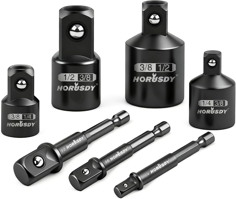 4PCS SET INCLUDES: 2 reducers in 3/8” female to 1/4” male and 1/2” to 3/8”and 3 adapters in 1/4" Female to 3/8” Male, 3/8” to 1/2”, and 1/2" to 3/4 Inch to convert all your impacts to different size sockets.