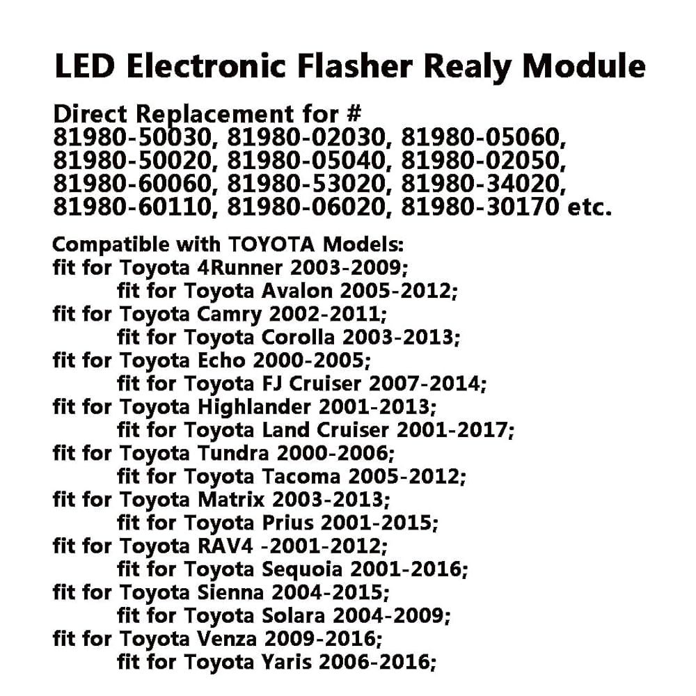 LED Flasher Fits Models : Flashers relay assembly fit for TYT 4Runner 2003-2009 | FJ Cruiser 2007-2014 | Land Cruiser 2001-2017 | Tundra 2000-2006 | Tacoma 2005-2012 | Highlander 2001-2013 | Sequoia 2001-2016 | Sienna 2004-2015 | RAV4 2001-2012.