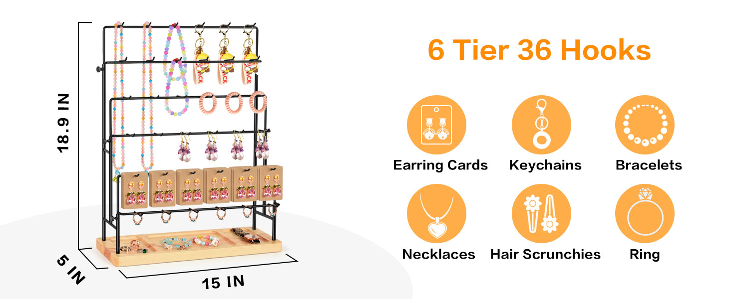 【36 Hooks for More Items】Measure:15 x 5 x 18.9 inches, this earring organizer has 6 layers and 36 hooks, giving you more room to place your earring jewelries. Each hook is 2.5 inches wide between each other, making it not easy to overlap the two jewelry cards.The stepped design provides great visibility and allows you to see the jewelry accessories you need at a glance.