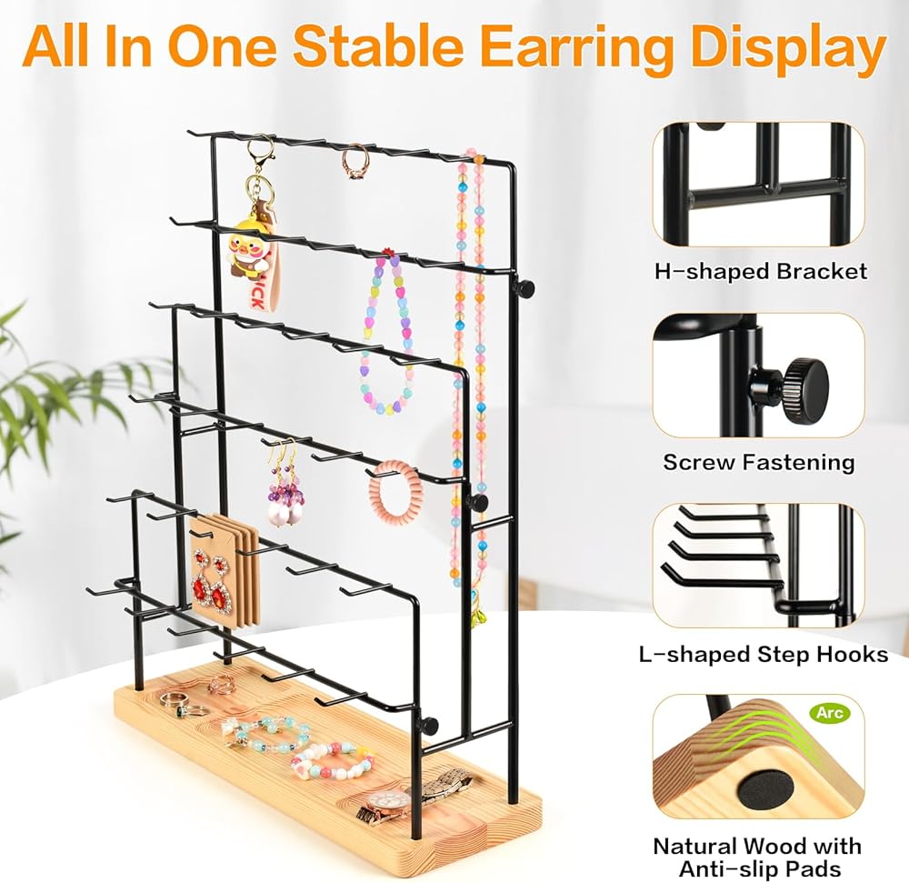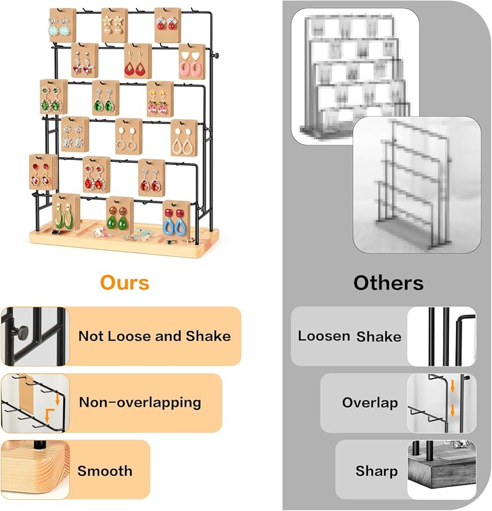 【Enhanced Stability & Anti-Shake】This upgraded earring display adopts an H-shaped integrated composite column, which is fixed by side tightening screws, making it less prone to shaking, more stable, and easy to install. It is equipped with 4 anti slip pads that can be attached to the bottom of the bracket, not only to prevent sliding, but also to prevent noise and scratches on the table when moving. A sturdy and stable wooden base, you don't have to worry about the jewelry rack being knocked over.