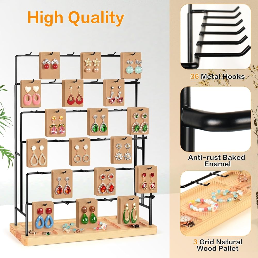【Long-Lasting Materials】The earring holder is made of high-quality metal and natural wood materials, the metal surface is coated with black coating, after hardening treatment, smooth will not scratch the earring. The metal rod on which the earrings are hung has made a slight upward curve, making the jewelry card not easy to fall down.