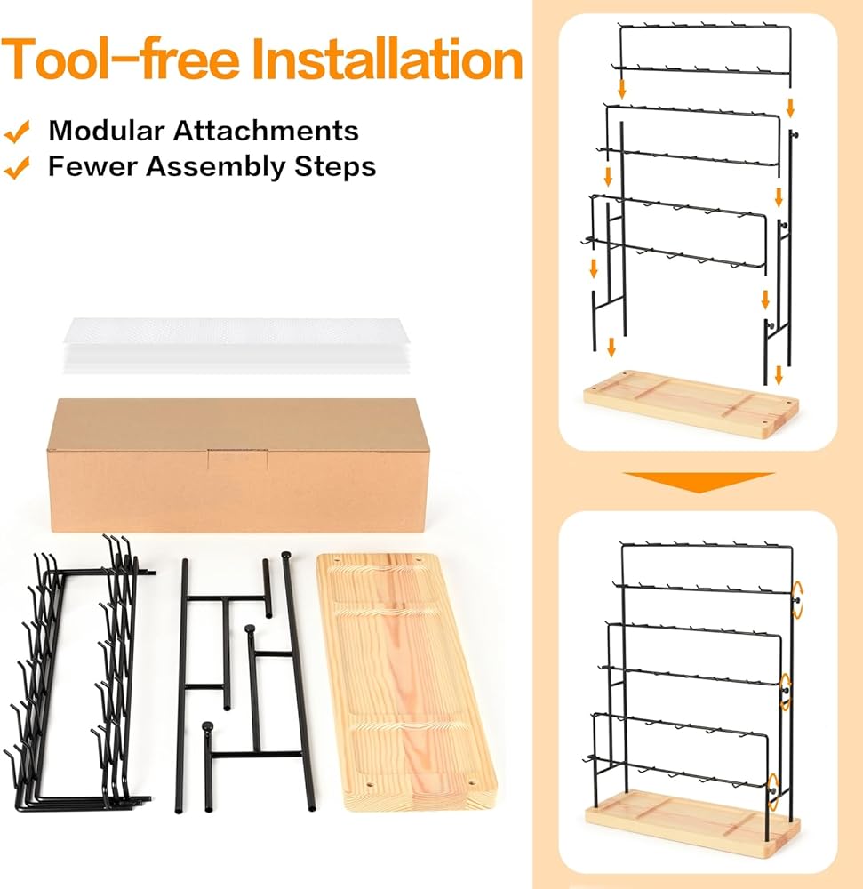 【Easy Assembly】Simply insert the H-shaped metal bars into both sides of the wooden panel, then install three identical hook frames into the metal bar holes and tighten the reinforcement screws on the sides. This eliminates frame wobbling when retrieving items.
