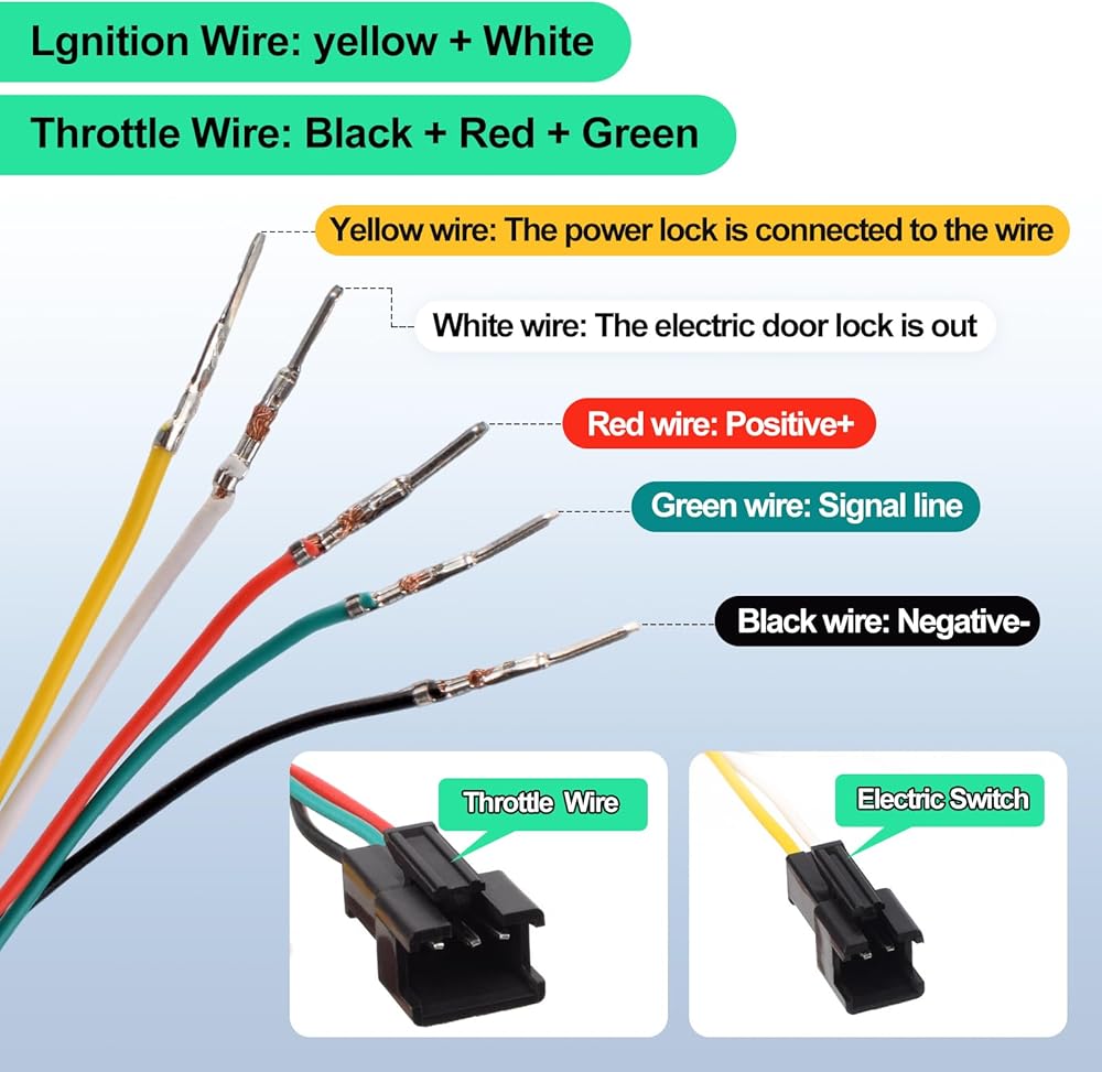 Easy installation: Plug and Play design for a solder-free.Ignition Wire: Yellow + White;Throttle Wire: Black + Red + Green,After installation, Turn the key to enable throttle response