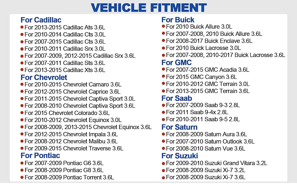 Fit for Chevrolet: For 2010-2015 Chevrolet Camaro 3.6L, for 2012-2015 Chevrolet Caprice 3.6L, for 2011-2015 Chevrolet Captiva Sport 3.0L, for 2008-2010 Chevrolet Captiva Sport 3.6L, for 2015 Chevrolet Colorado 3.6L, for 2010-2012 Chevrolet Equinox 3.0L, for 2008-2009, 2013-2015 Chevrolet Equinox 3.6L, for 2012-2015 Chevrolet Impala 3.6L, for 2008-2012 Chevrolet Malibu 3.6L, for 2009-2015 Chevrolet Traverse 3.6L