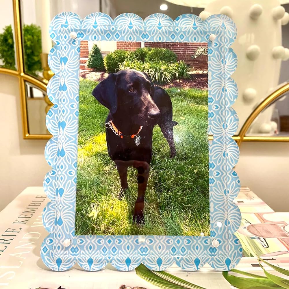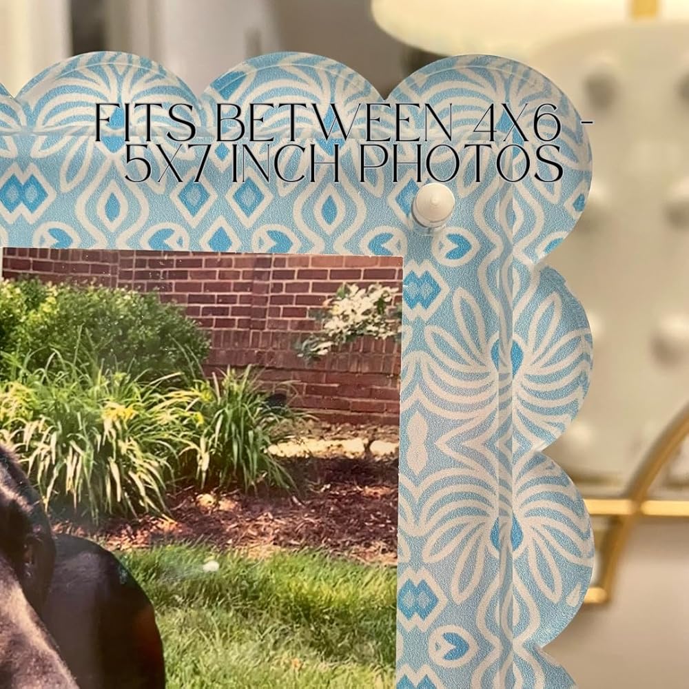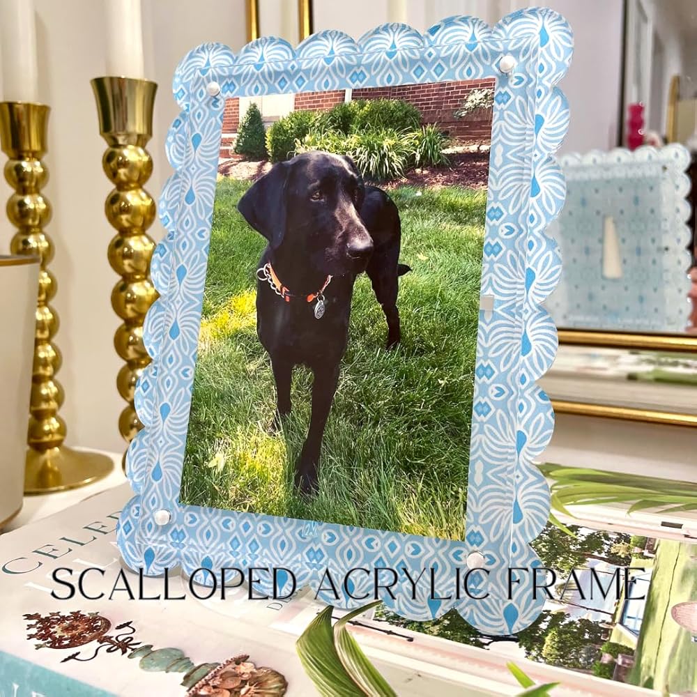 Bring color, charm, and personality to any space with this Katie Romeo Designs Scalloped Magnetic Acrylic Frame. Designed with Katie's signature grandmillennial geometric art pattern with beautiful shades of blue and white, this 5x7 frame turns your favorite photos into a piece of art. The double-sided magnetic design makes it easy to swap photos in seconds, while the clear acrylic and scalloped edges add a chic, polished touch that complements any decor style - from coastal and preppy to modern grandmillennial. Perfect for displaying on a desk, nightstand, entry table, or bookshelf, this frame also makes a thoughtful hostess, birthday, or holiday gift. Whether you're styling your home or gifting someone special, it's a beautiful way to showcase life's most joyful moments.