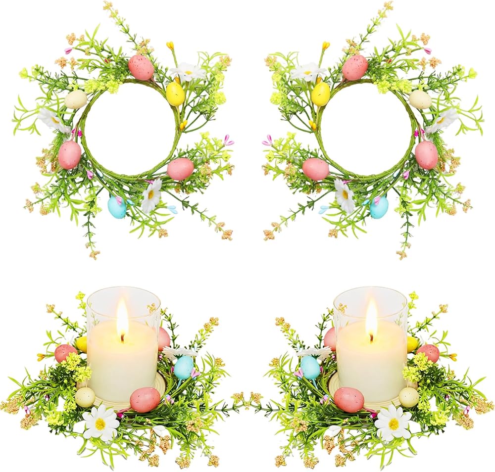 4 Pack Easter Egg Candle Rings Wreath with Daisy Flower Spring Egg and Pastel Pip Berry Candle Rings Holder Wreaths 4" Center for Holiday Home Kitchen Cabinet Table Centerpiece Decor