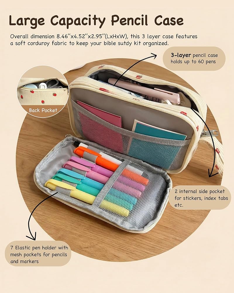 CUTE & LARGE PENCIL CASE: Designed with the modern woman in mind, our supplies comes with a large corduroy pencil case for storage. The beautiful strawberry pencil bag encourages you to build a consistent daily habit of study, reading and note-taking, turning your quiet time into a visually pleasing and spiritually enriching moment.