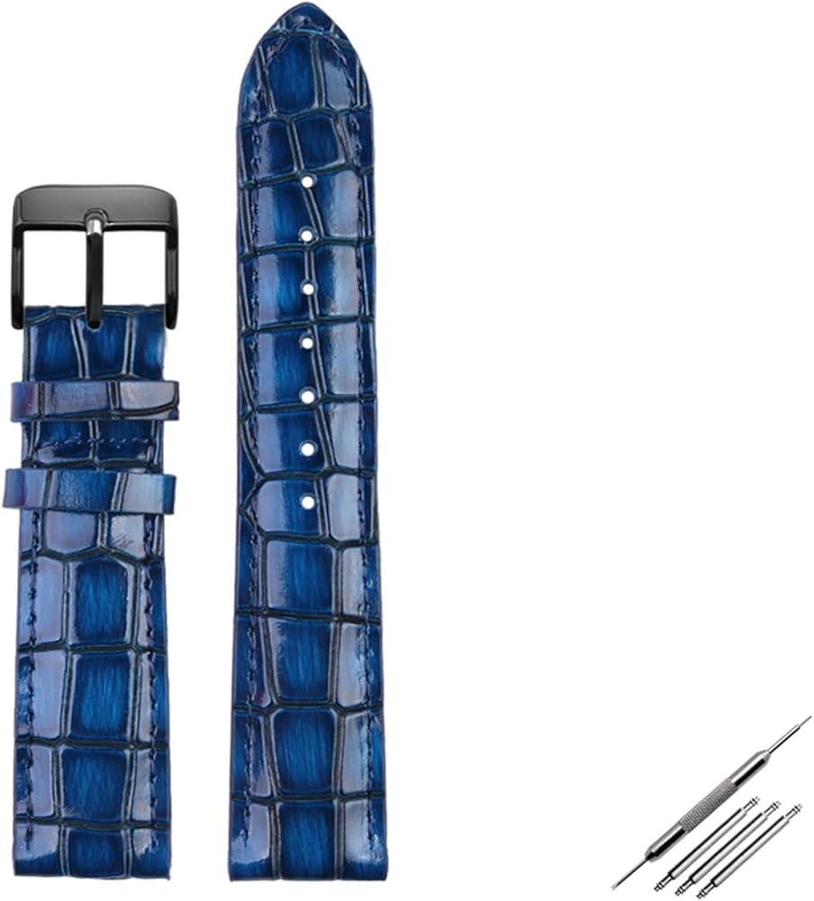 Wscebck Crocodile Texture Calfskin Leather Watch Strap18mm 20mm 22mm Watchband for Men Women Watch Band Solid Buckle (Color : Blue Black, Size : 18mm)