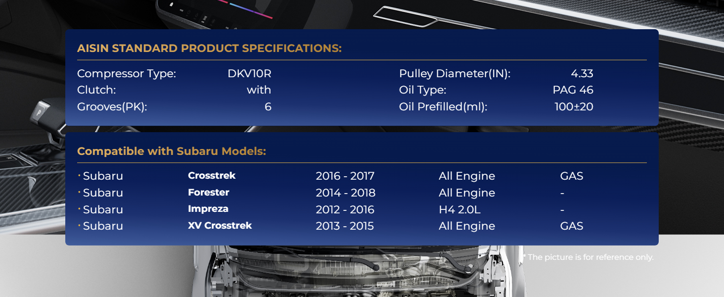 [About AISIN] - Leveraging AISIN's legacy as an automotive leader since 1965, our Air Conditioner AC Compressors are engineered to the exacting standards of global manufacturers, providing robust, seamless operation and dependable long-term performance
