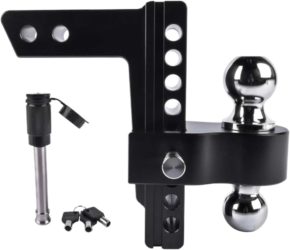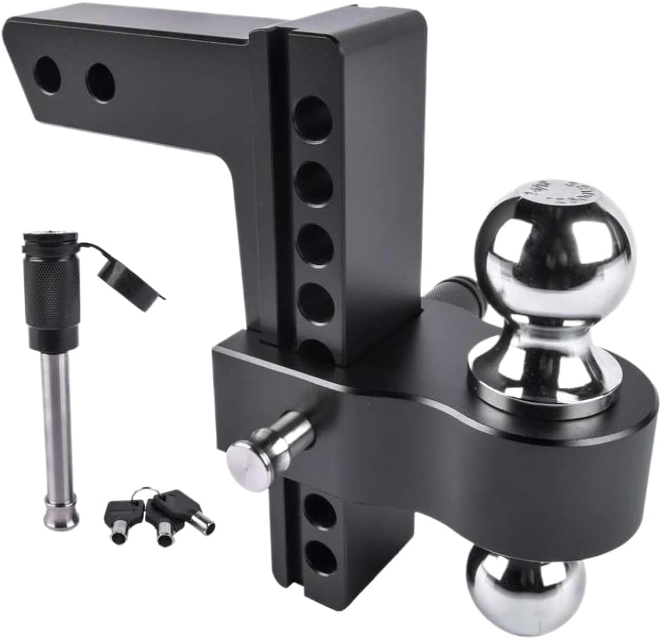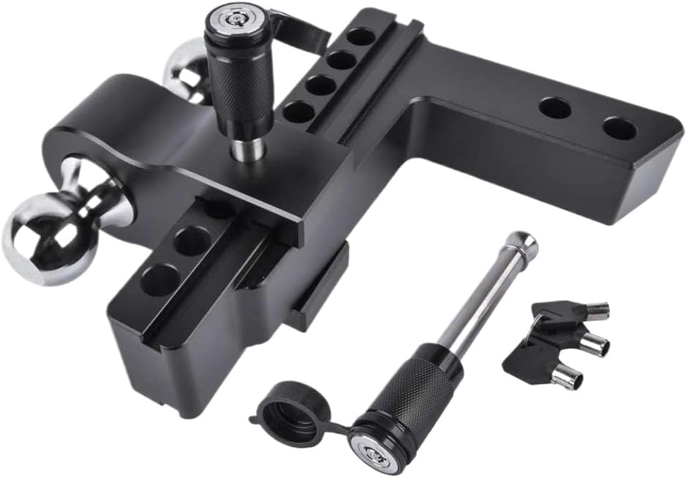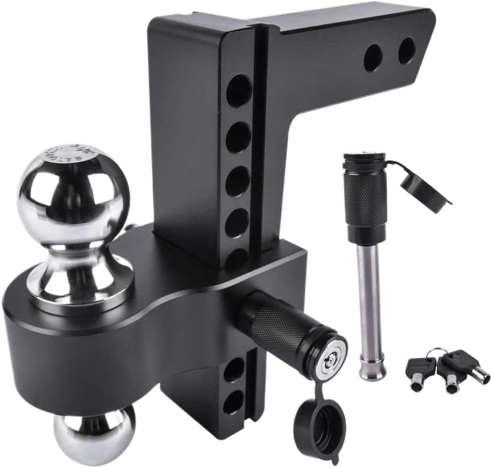 AP03 12 500 LBS Black Adjustable Trailer Hitch Fits 2-Inch Receiver Only 8-Inch Drop Rise Aluminum Drop Hitch This adjustable trailer hitch is designed for use with a 2-inch receiver and provides up to 8 inches of drop or rise to help level trailers on uneven terrain.Constructed from aluminum, the hitch offers a balance of strength and reduced weight.It has a towing capacity of 5, 000 pounds, suitable for medium-duty towing applications.The black finish resists corrosion and maintains a clean appearance over time.The hitch includes necessary hardware for installation and adjusts easily to accommodate different hitch heights.It is intended for straight-line towing and should be used within its rated capacity.