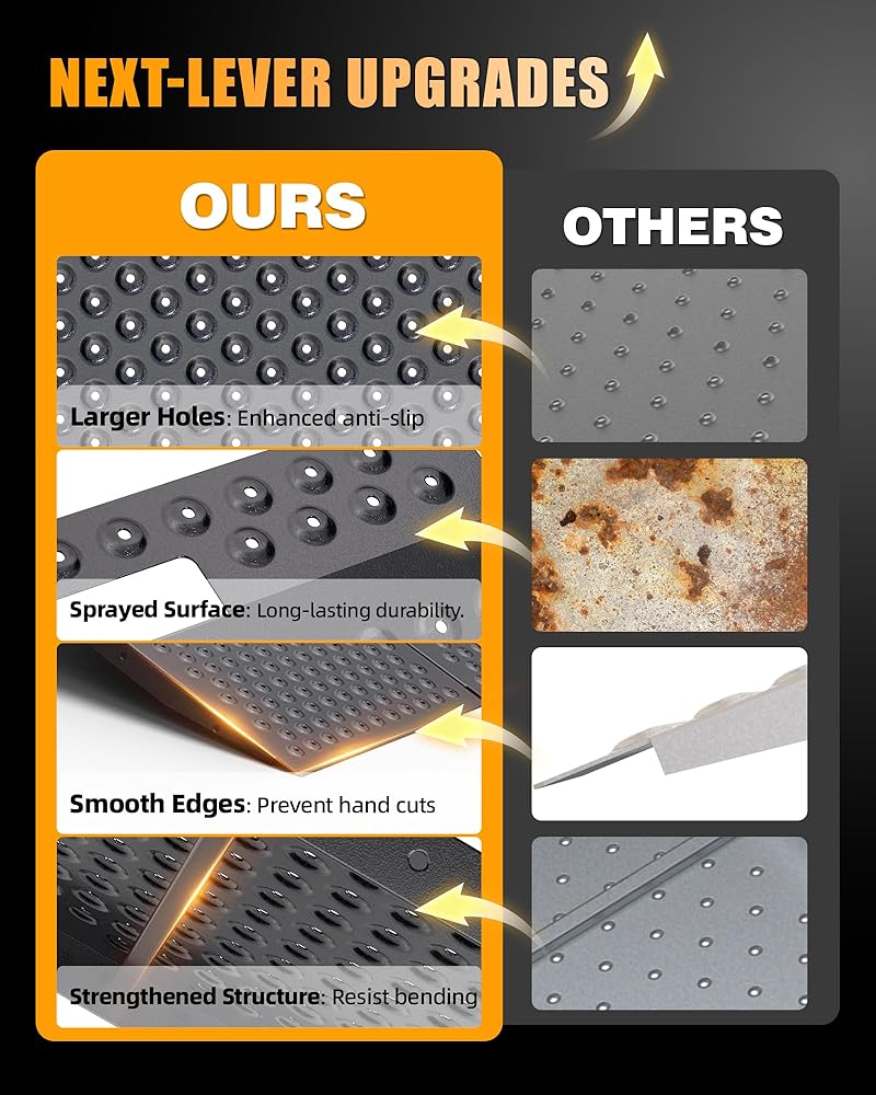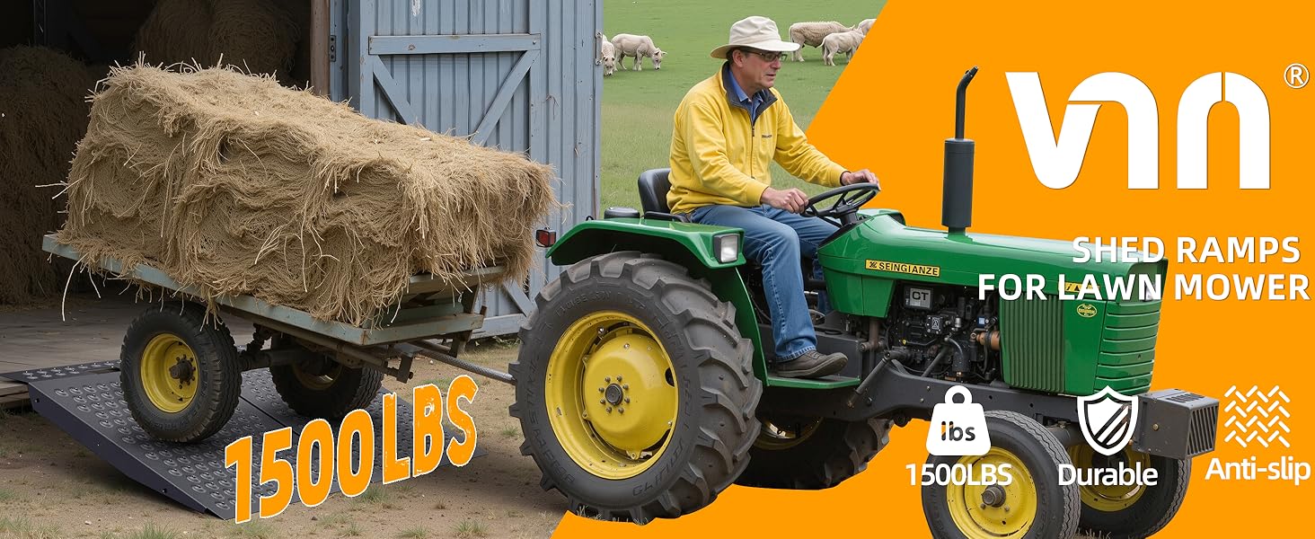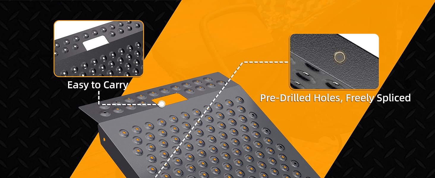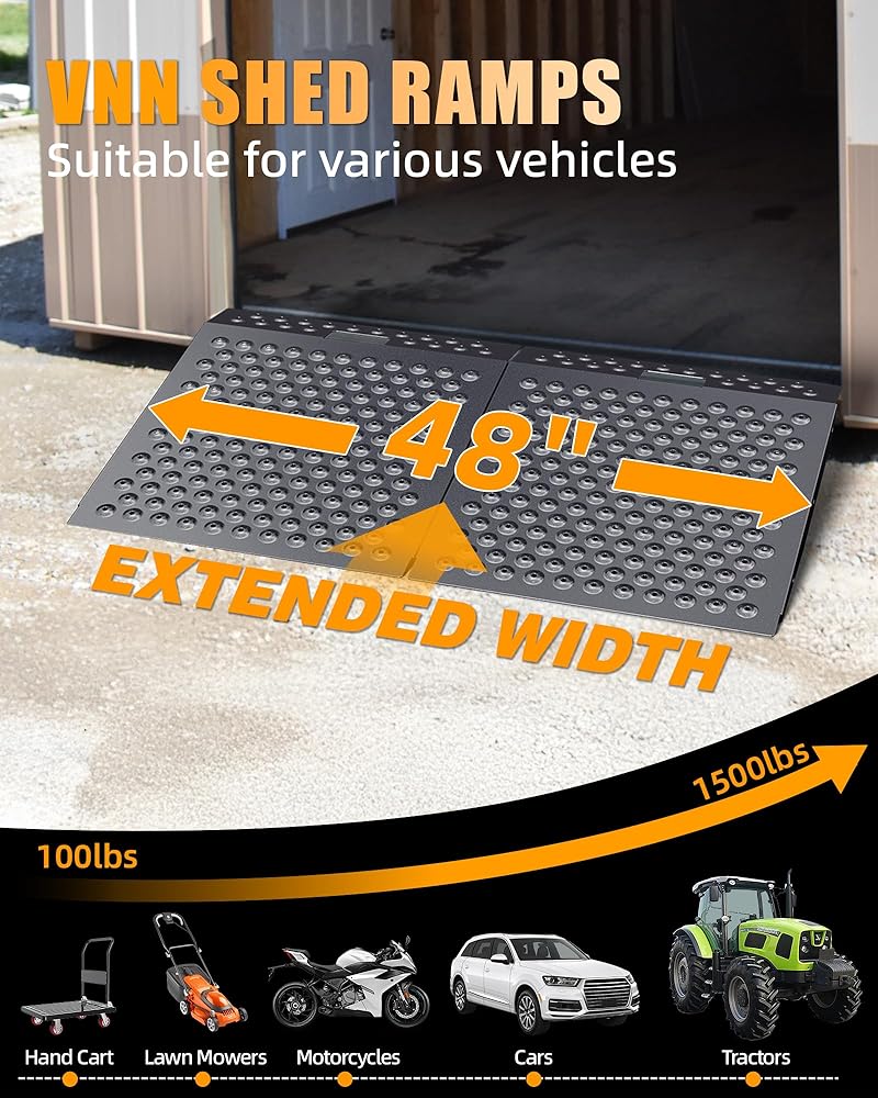 Improved Size & Anti-Slip Design: The VNN shed ramp measures 29" L x 24" W x 2" H per piece. Its extended width and optimized slope design create a 12.7° tilt angle, improving traction and ensuring riding mowers ascend smoothly. The punched hole surface enhances grip and facilitates water drainage, providing a reliable, non-slip surface in all weather conditions.