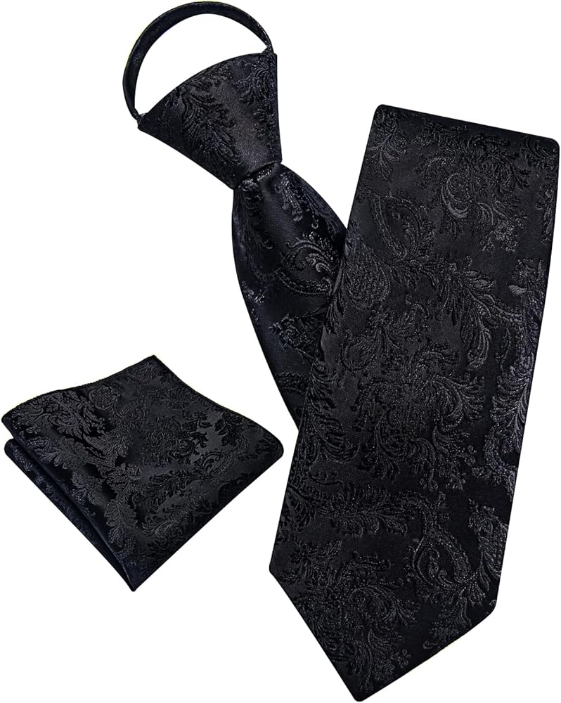Zipper tie including:necktie+pocket square+box,tie size 3.15*20inch(8*51cm),pocket square size:9.45*9.45inch(24*24cm),The pre-tied ties are easy to wear and time saving, only takes seconds to tie