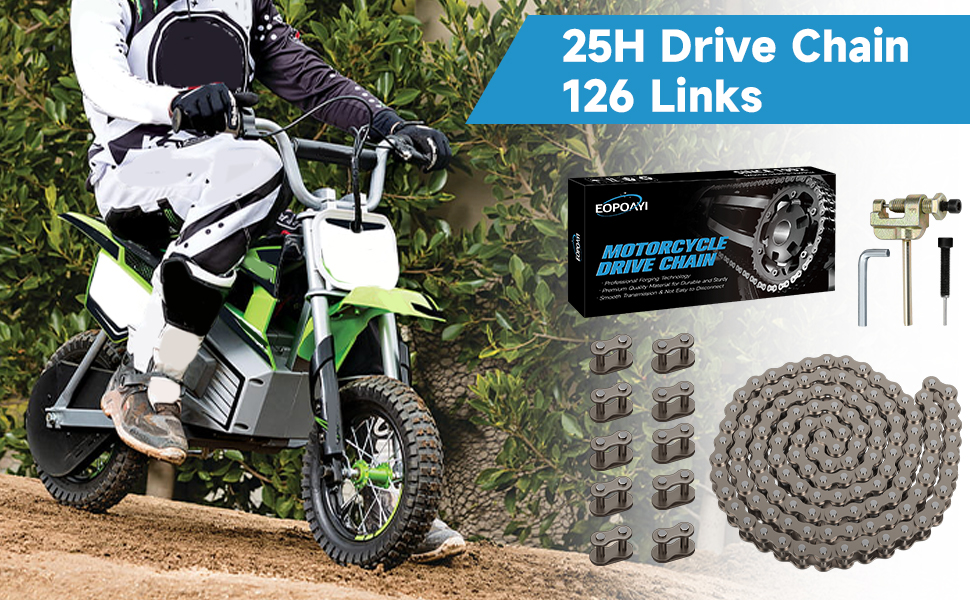 Package includes: 1 x 25H Chain 126 Links, 10 x 25H Master Links, 1 x Chain Breaker, 1 x Wrench