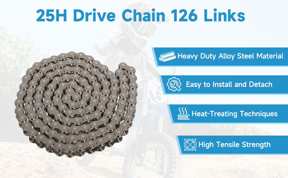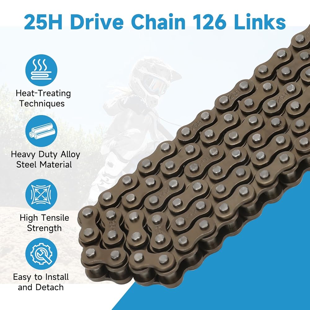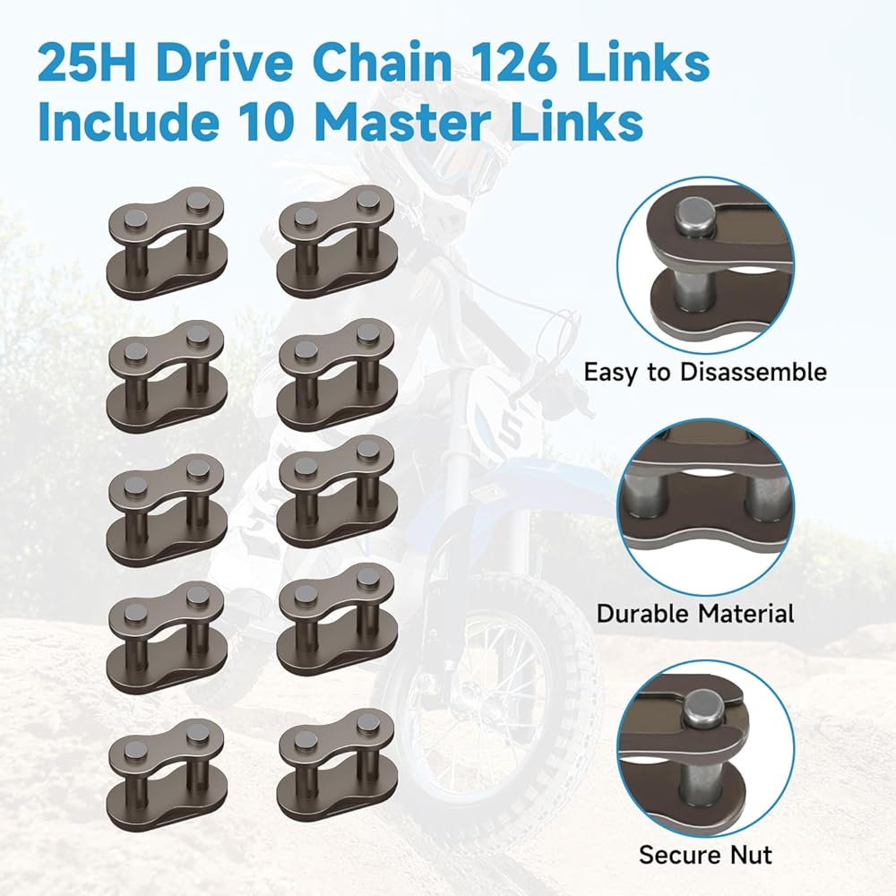 Easy Installation: 25H drive chain 126 links is simple to install and come with extra #25 chain master links for lengthening as needed. Regular inspection and maintenance of the dirt rocket bike drive chain are essential for preserving off-road motorcycle performance