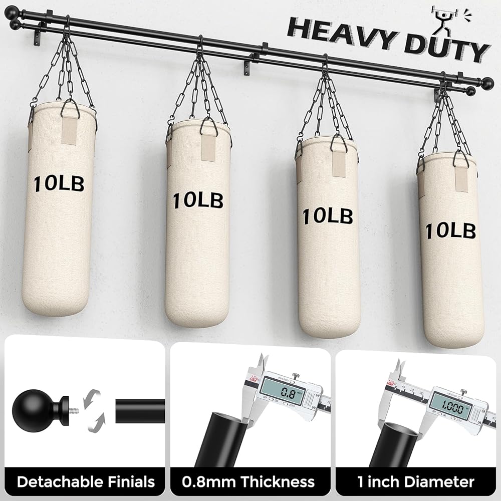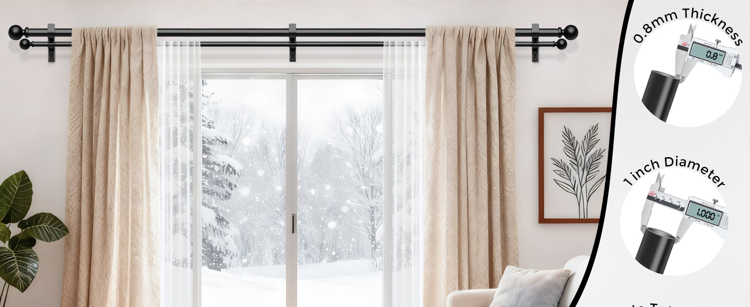 [STURDY AND DURABLE] The Wolistsa heavy duty curtain rods are made from high-quality carbon steel with a carbon content of 0.5%. With a diameter of 1" and a wall thickness of 0.8 mm, the adjustable curtain rods can hold up to 33 lbs. Compared to other metal curtain rods on the market with a diameter of 5/8" and a thickness of 0.5mm, our double curtain rod black redefines 'heavy duty' with stronger materials and thicker rods