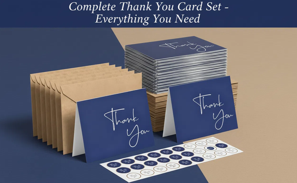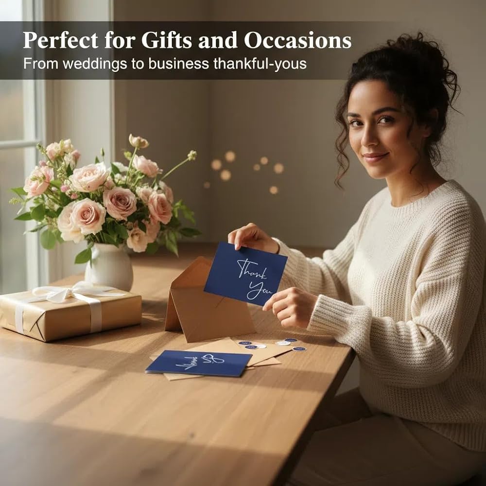 100 Pack Thank You Cards With Envelopes Bulk Set & Stickers - 4x6 inch Blank Thank You Notes Bulk Box Set - Large Note Card Small Business, Wedding, Baby Shower & Bridal Shower - Navy Blue