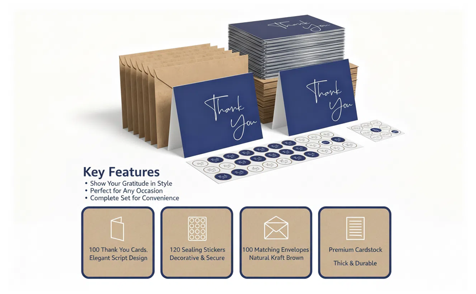🎁 MODERN & STYLISH, WITH STICKERS - Make every thank-you unforgettable with these elegantly designed bulk thank you cards, crafted from premium cardstock. Each set includes 100 cards, matching envelopes, seal stickers, plus 120 stickers—perfect for adding a personal touch to your heartfelt messages.
