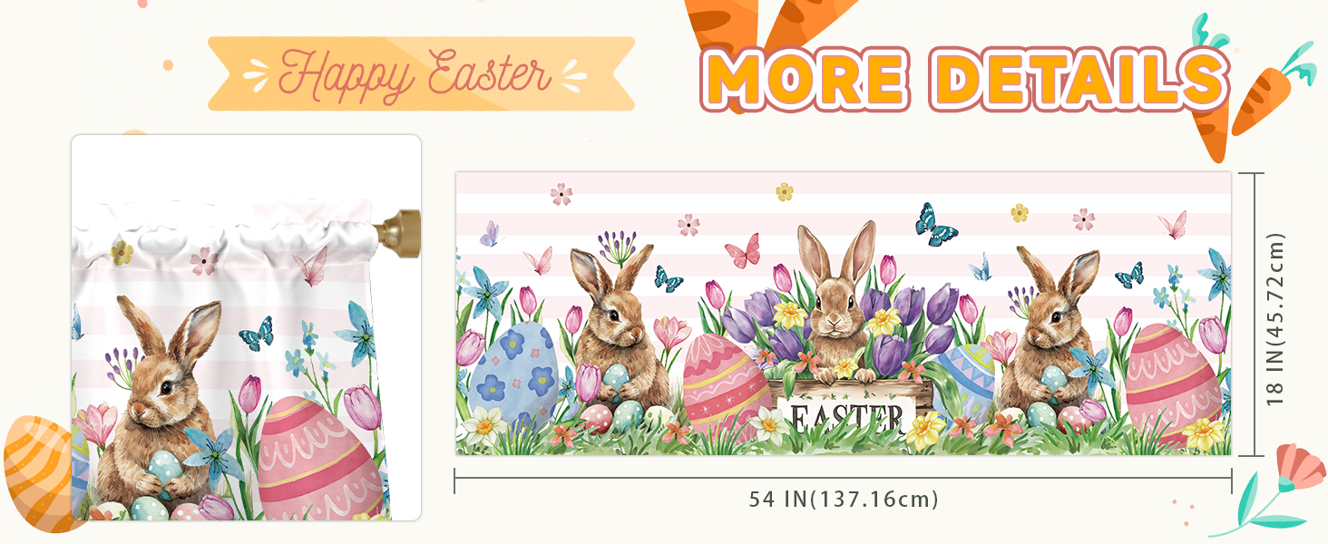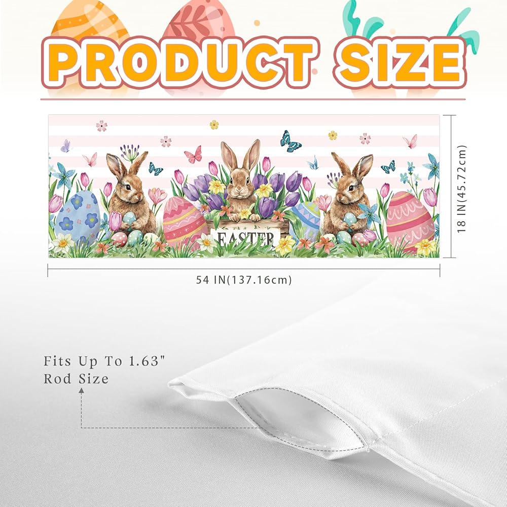 【Package Contents】You will receive an Easter window valance sized 54x18inch, with a 2.56inch/6.5cm wide rod pocket at the top, suitable for most standard rods or decorative curtain rods/poles, and easy to install. It does not wrinkle.