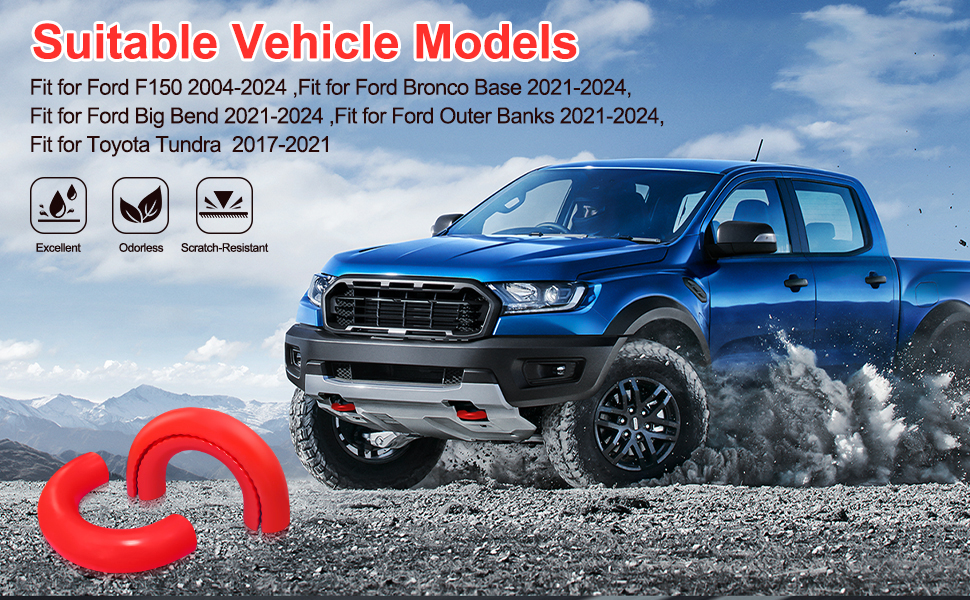【Not Fit】Keep in mind that this product Not fit for F150 2004-2026STX 4x4 and the Lariat. These diameter of hooks is thinner, there is play, may require trimming. Not fit for Ford Super Duty/Ranger, Only fit Bronco variant with default "Plastic" bumper, and Tundra 2017-2021(Not fit for TRD Pro: Require Trimming).