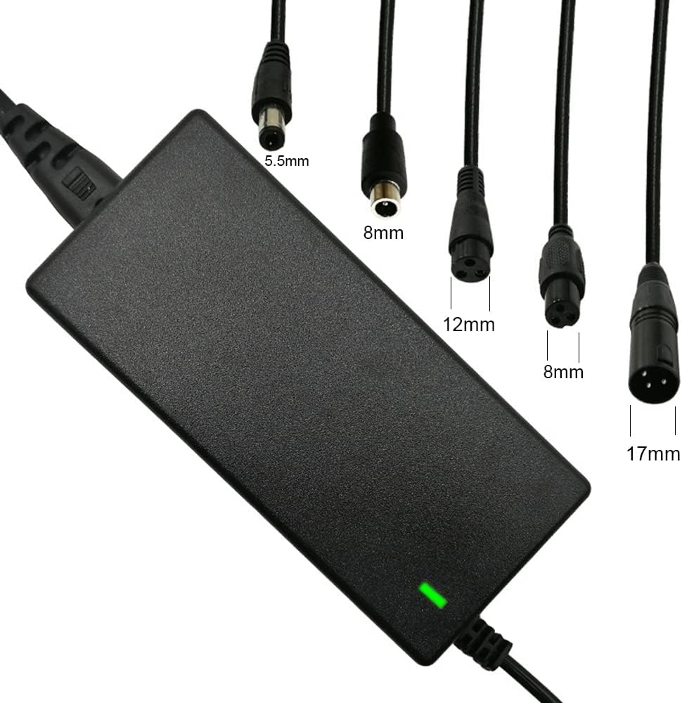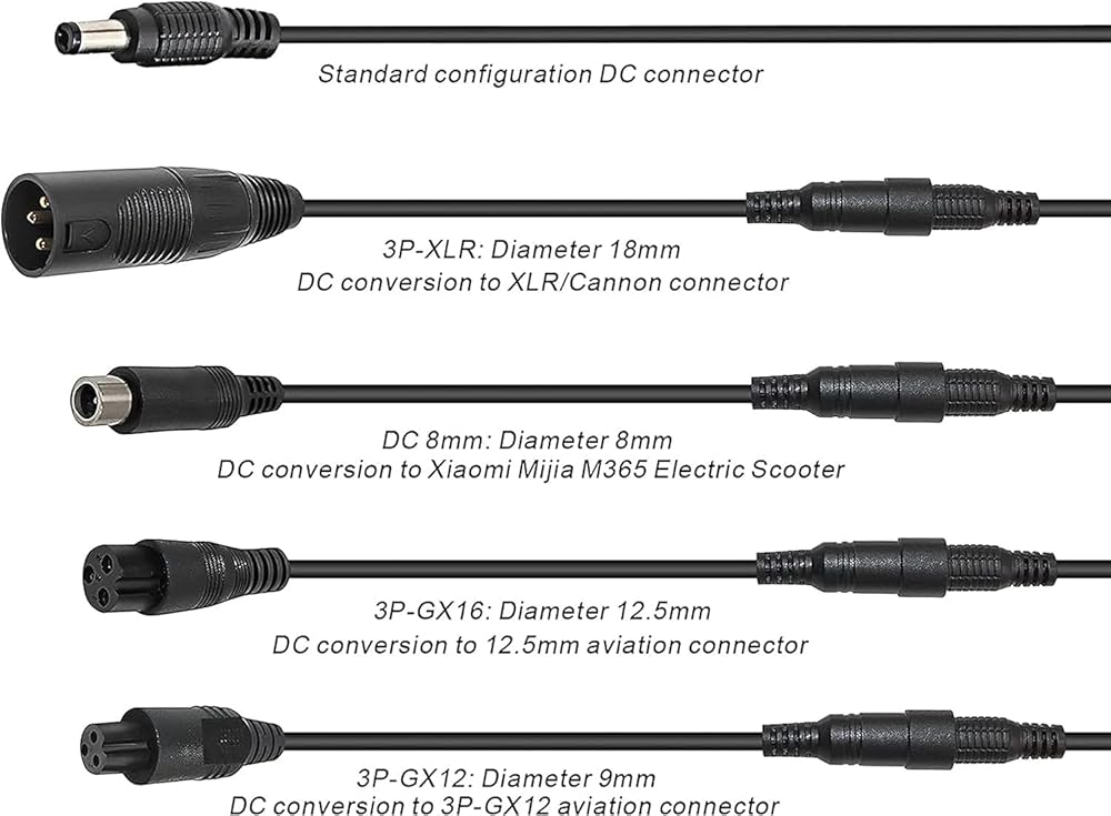 - 5 موصلات في 1: يأتي الشاحن مزودًا بقابس DC ذو شق واحد مقاس 5.5 مم، وموصل ثلاثي الشقوق 8 مم، وموصل ثلاثي الشقوق 12 مم، وموصل RCA مقاس 8 مم، وموصل XLR ذكر ثلاثي السنون.