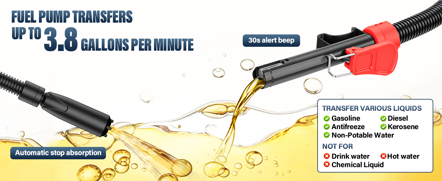 Auto-Stop Smart Leak Protection: This electric fuel transfer pump features an intelligent auto-stop nozzle that stops the flow when the tank is full—locking in fuel, preventing leaks, and keeping your space clean and safe. A 30-second alarm will sound to remind you when the tank is full. Ideal for safe, hassle-free refueling of your car, lawn mower, tractor, motorcycle, and even your yacht.
