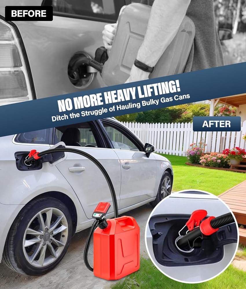 3.8 GPM High-Efficiency Fuel Transfer: This gas can pump can achieve a flow rate of up to 3.8 GPM, making refueling of vehicles, machinery, or equipment quick and efficient.This transfer pump is perfect for pumping liquids such as gasoline, diesel, kerosene, antifreeze, light oils and non-potable water. Our gasoline transfer pump features an upgraded locking clip that securely fix the nozzle to the receiving container.