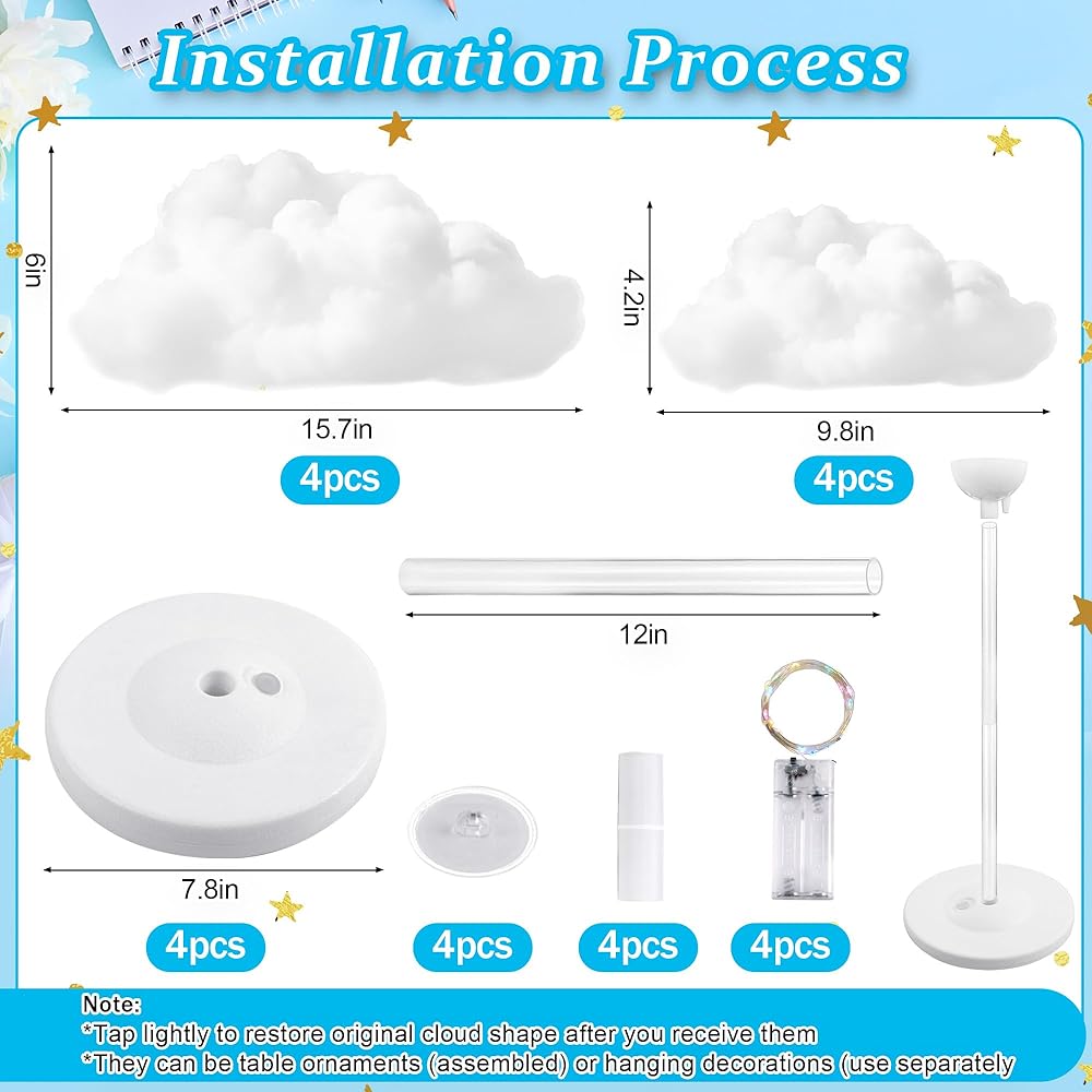 Complete LED Cloud Lighting Kit: This all-in-one DIY kit includes 4 large and 4 medium simulated clouds, 4 stable stands with bases, and 8 battery-powered string lights (batteries not included). Everything you need is provided for your cloud baby shower decorations and ceiling decor.