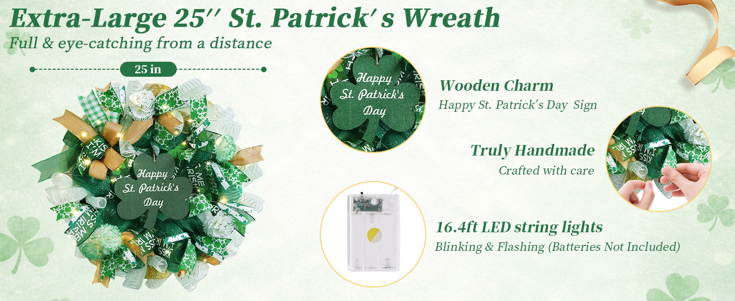25 Inch Large St Patricks Day Decorations Wreath, Handmade Artificial Shamrock Wreath for Front Door with LED Lights, Kiss Me Im Irish for Wall Decor Window, Saint Paddys Day Decorations