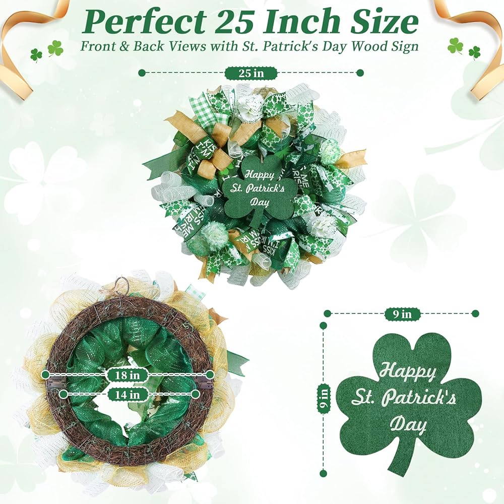 Storage Bag & Customer Support: May your St Patrick's Day be filled with joy and luck. After the festival,simply place the front door wreath into the included storage bag for proper preservation and easy reuse next year, allowing this warm Irish festive atmosphere to continue year after year. If you have any questions, please feel free to reach out to us via Amazon