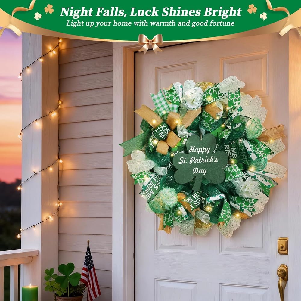 25-Inch Versatile Irish Wreath: With a generous 25-inch size, ideal for front doors, porches, living rooms, offices, windows, fireplaces, and bookshelves. When paired with warm white string lights (batteries not included), the soft glow wraps around the clovers and plaid at night, creating a warm, dreamy ambiance that instantly elevates the mood