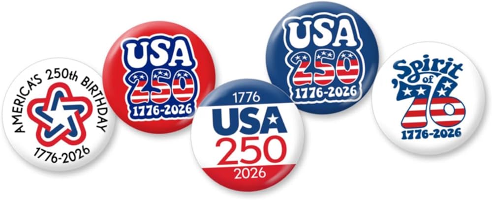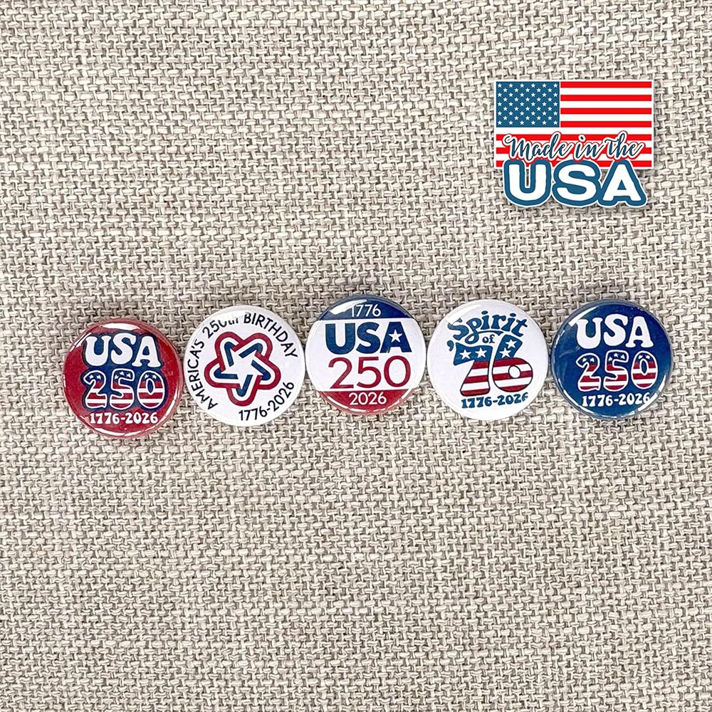 - PACK SIZE -- 25-pack MINI buttons with assorted designs for America's 250th Birthday