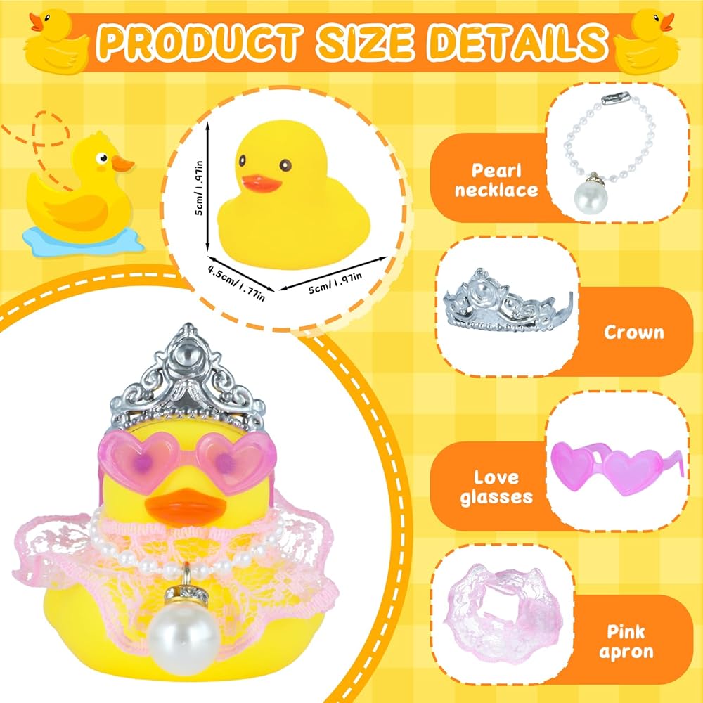 1pc Yellow Crown Lace Dress Rubber Duck Car Decor - Squeaky Dashboard Duck Accessories with Princess Crown, Heart Sunglasses, Pearl Necklace for Car Interior, Office, Home Decoration