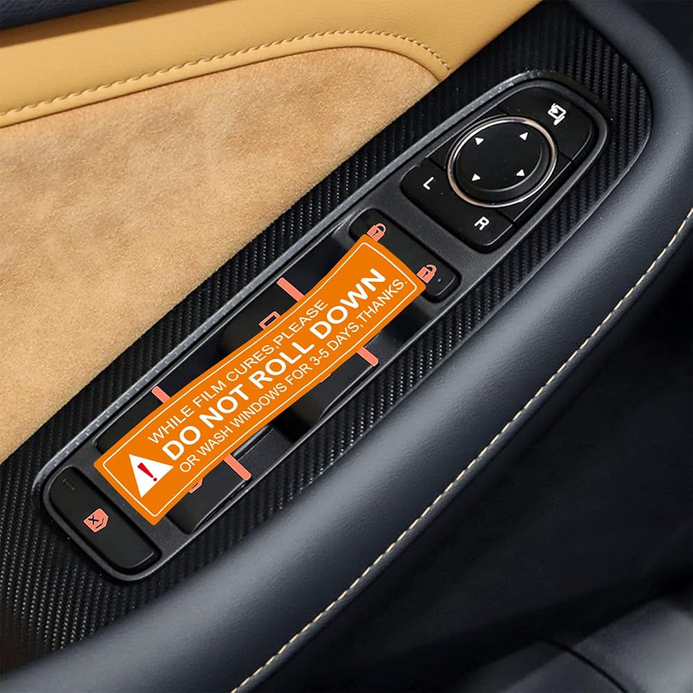 3. The orange and white rectangular stickers feature clear "Do Not Roll Down Windows" messaging against damage to fresh window tinting.
