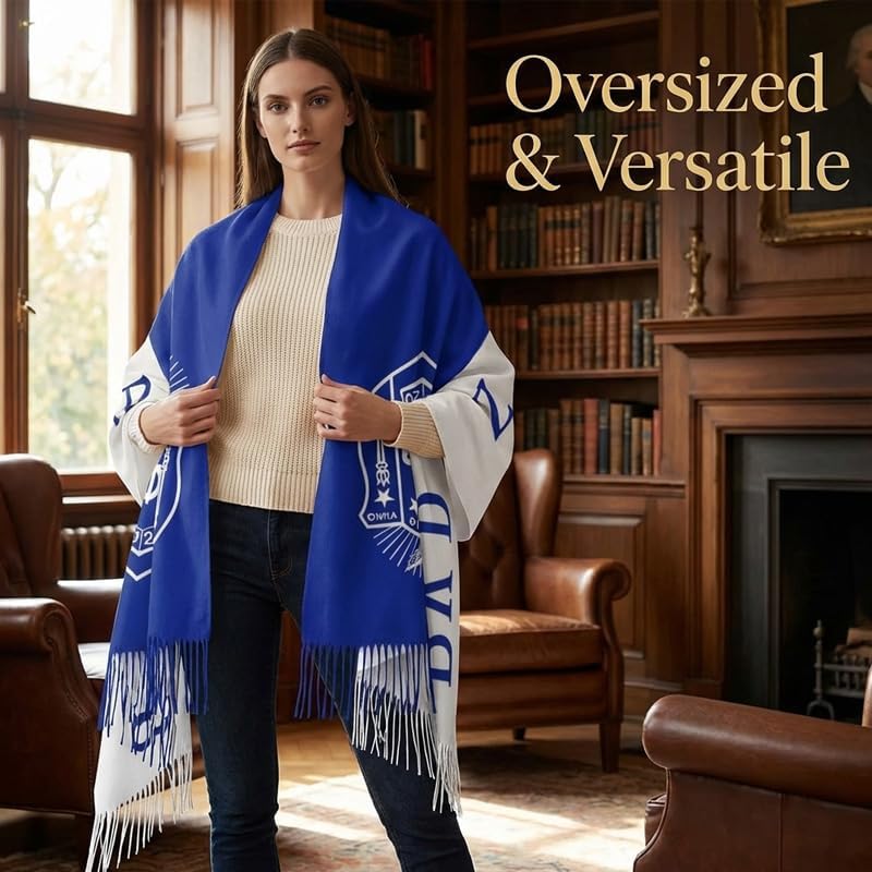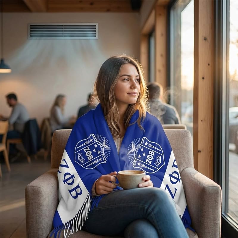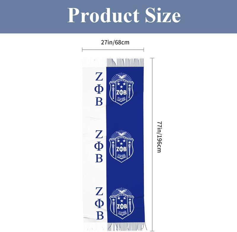 Exquisite Design: This scarf showcases colors and patterns associated with the ZPB Sorority, proudly displaying the signature blue and white palette and the Greek letters “ΖΦΒ.” Featuring elegant fringe detailing and generous dimensions, it offers a sophisticated drape that can be styled as a traditional long scarf, an elegant shawl, or a cozy blanket wrap—making it a clear emblem of sisterhood pride.