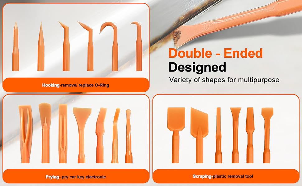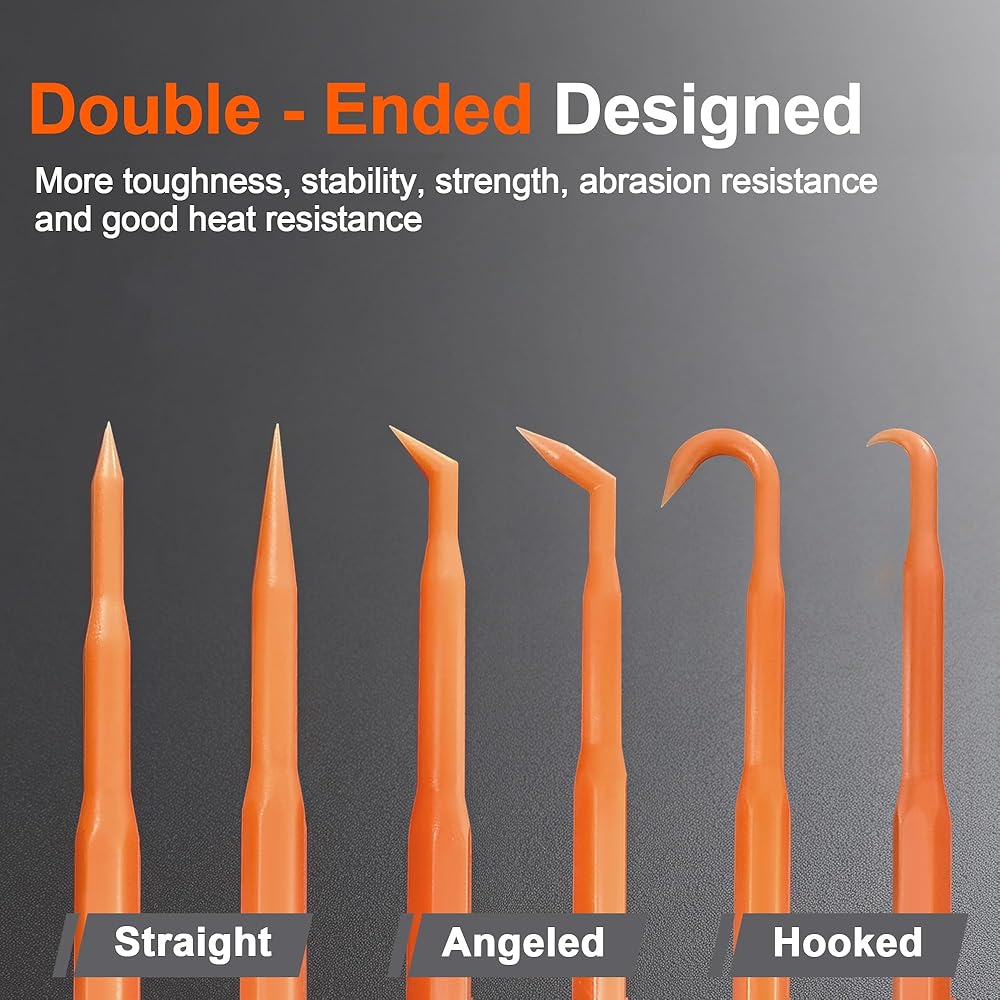 Set included: hook, offset hook, straight pick, pry-bar, mini tap down, scratch-free gasket scraper, plastic chisel…versatile tools come with plastic case for easy carry and storage