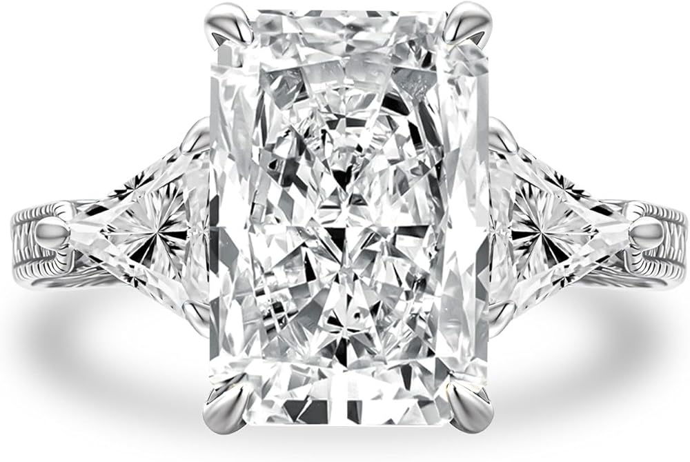 ELEGANT THREE-STONE DESIGN WITH PROFOUND MEANING: This exquisite ring features a brilliant 5-carat radiant cut center stone, accented by two sparkling trillion-cut side stones. The three-stone (Trilogy) design beautifully symbolizes your love story—representing the past, present, and future of your enduring commitment