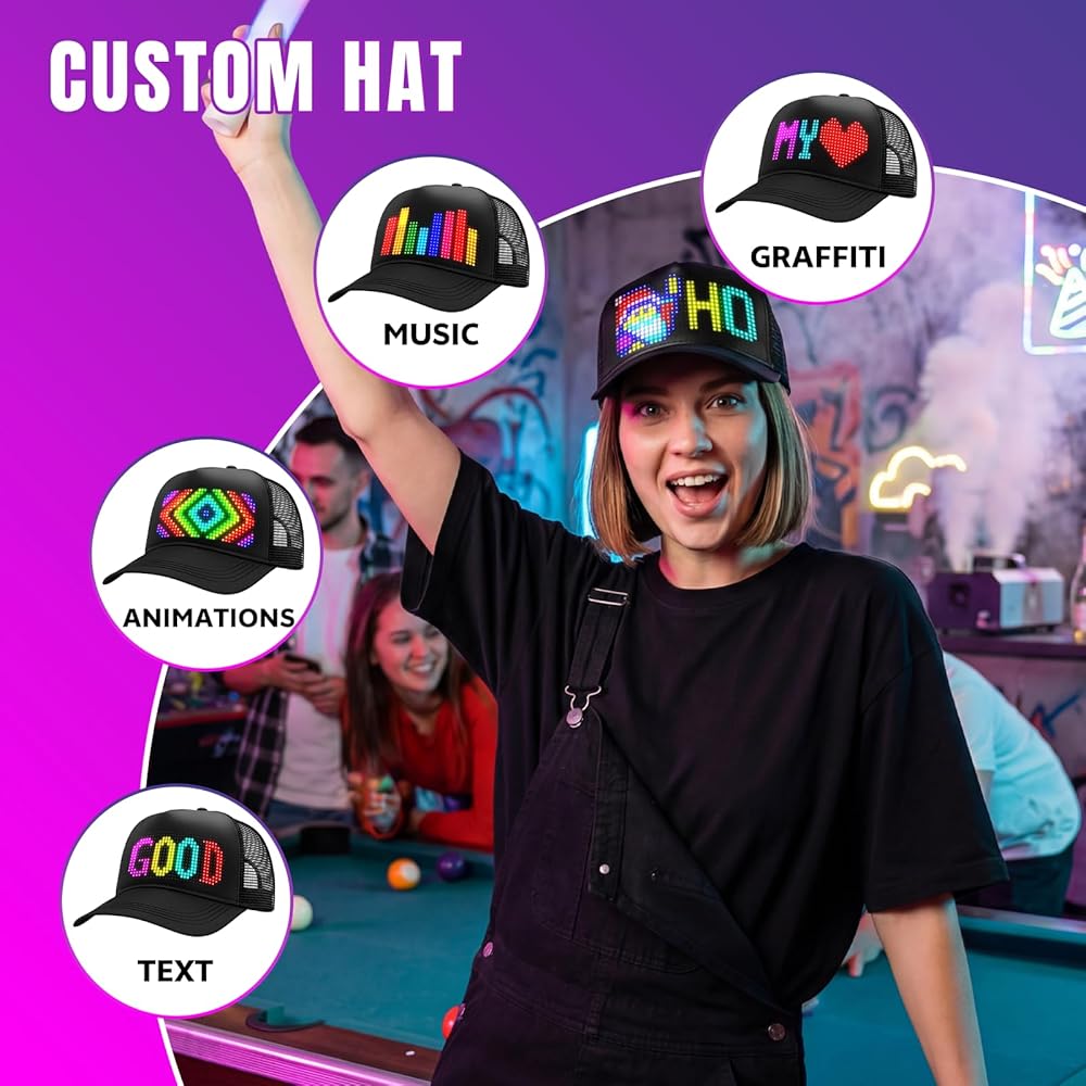 Rayhome LED Hat, Bluetooth Rechargeable LED Caps with Spare Battery, Full Color APP Control Display Screen Hats, Custom Text Patterns Animations Ventilate Funny Hat for Party Christmas Halloween