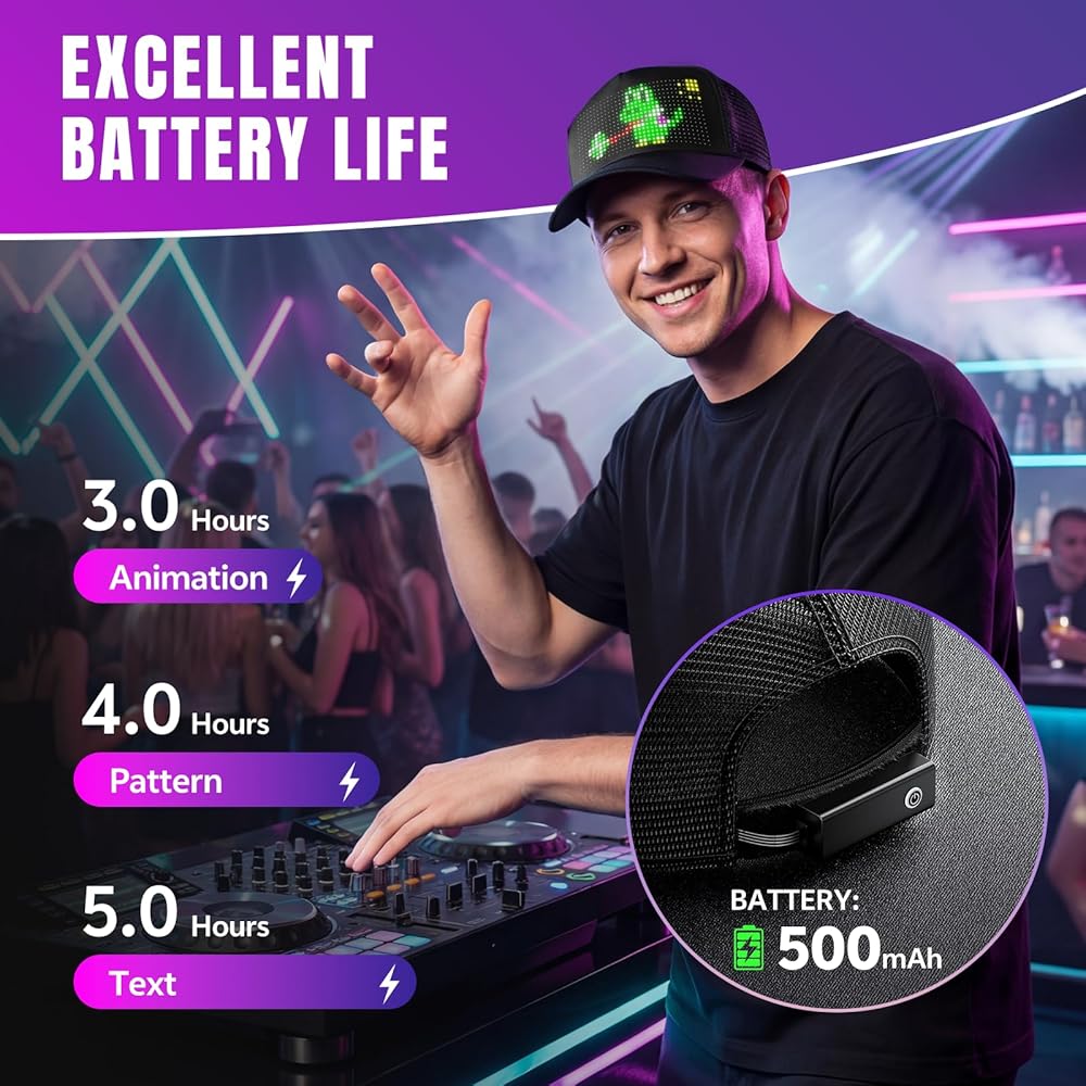 【Battery free range anxiety】This portable LED hat can display continuously for 5 hours and can be fully charged in just 2 hours. We also provide an additional battery for you to replace, with a cumulative battery life of up to 10 hours and the ability to charge anytime and anywhere using a portable power bank.