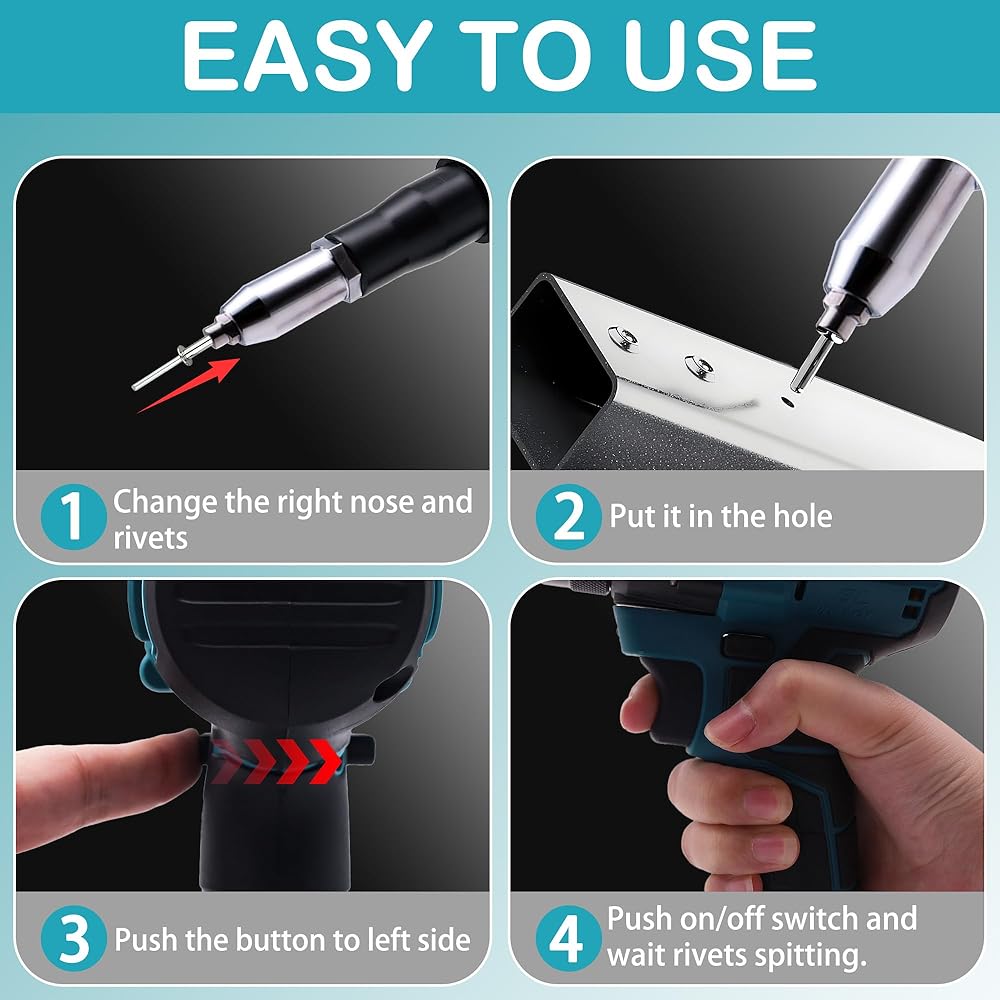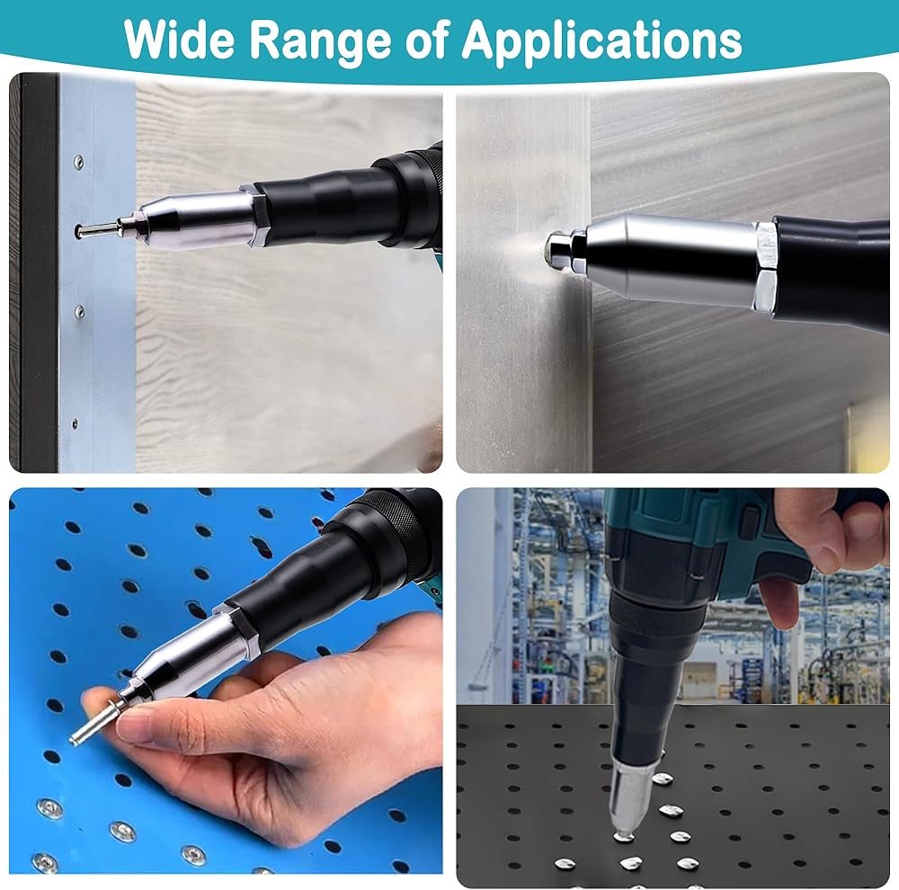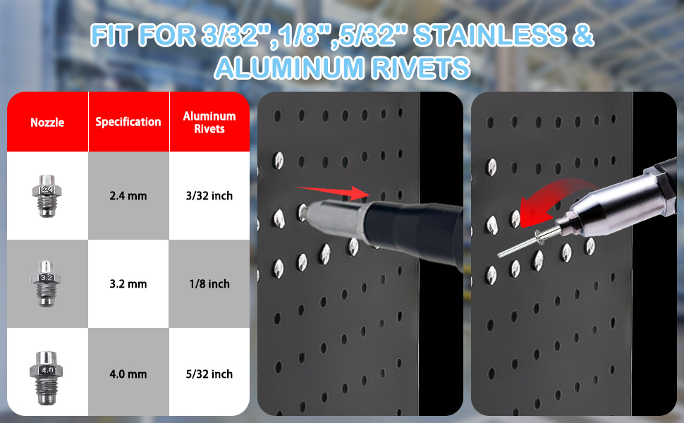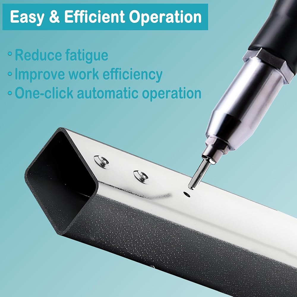 [Compatible with 3/32", 1/8", and 5/32" Rivets]:Engineered for versatility, this electric rivet gun works with 3/32" (2.4mm), 1/8" (3.2mm), and 5/32" (4.0mm) rivets. The quick-change nosepieces make it easy to switch sizes, supporting various materials such as sheet metal, aluminum panels, and auto body parts.